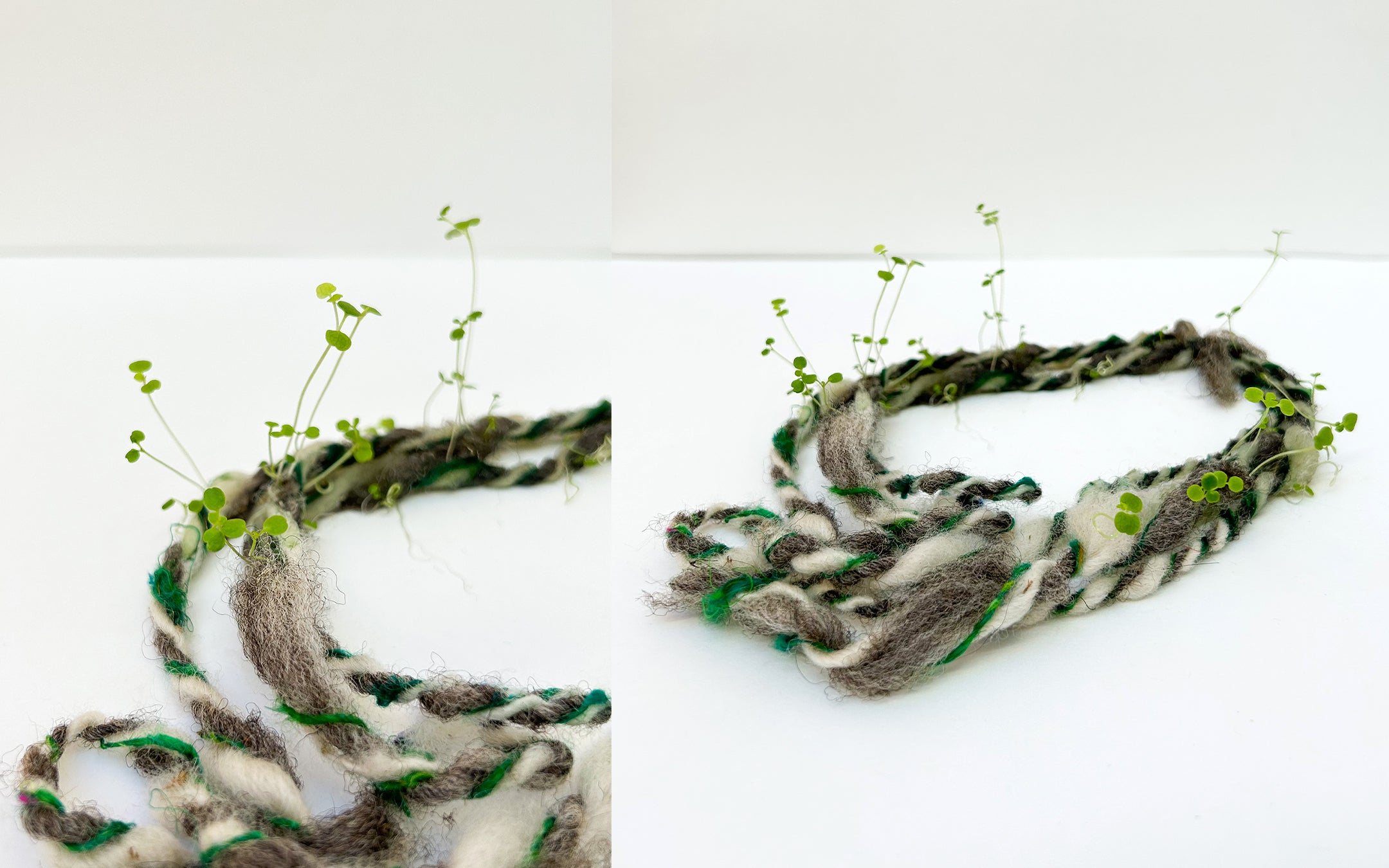 'Mossy Duo': lock spun Blue Face Leicester, Merino and Sari Silk 3ply Crepe and 4ply cabled sampler (77g & 15g)