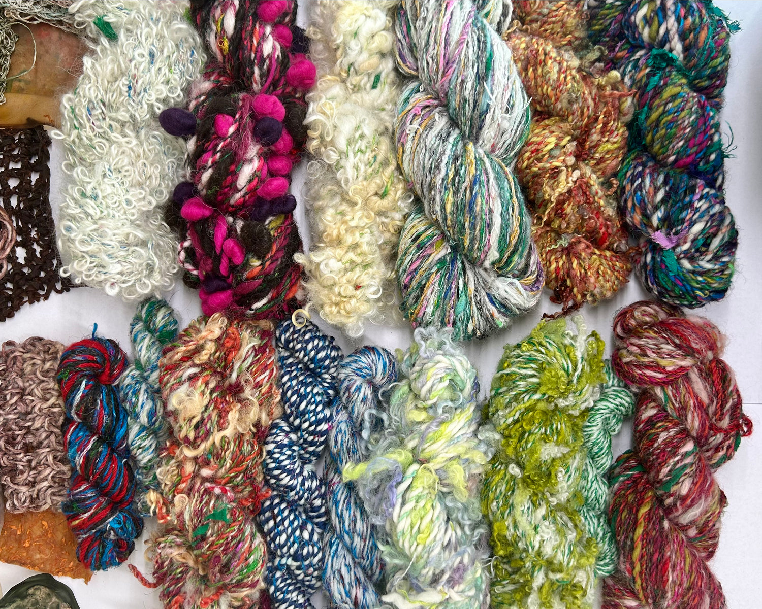 Hand spun and dyed art yarns. Featuring supercoiled yarns, reflective yarns and...