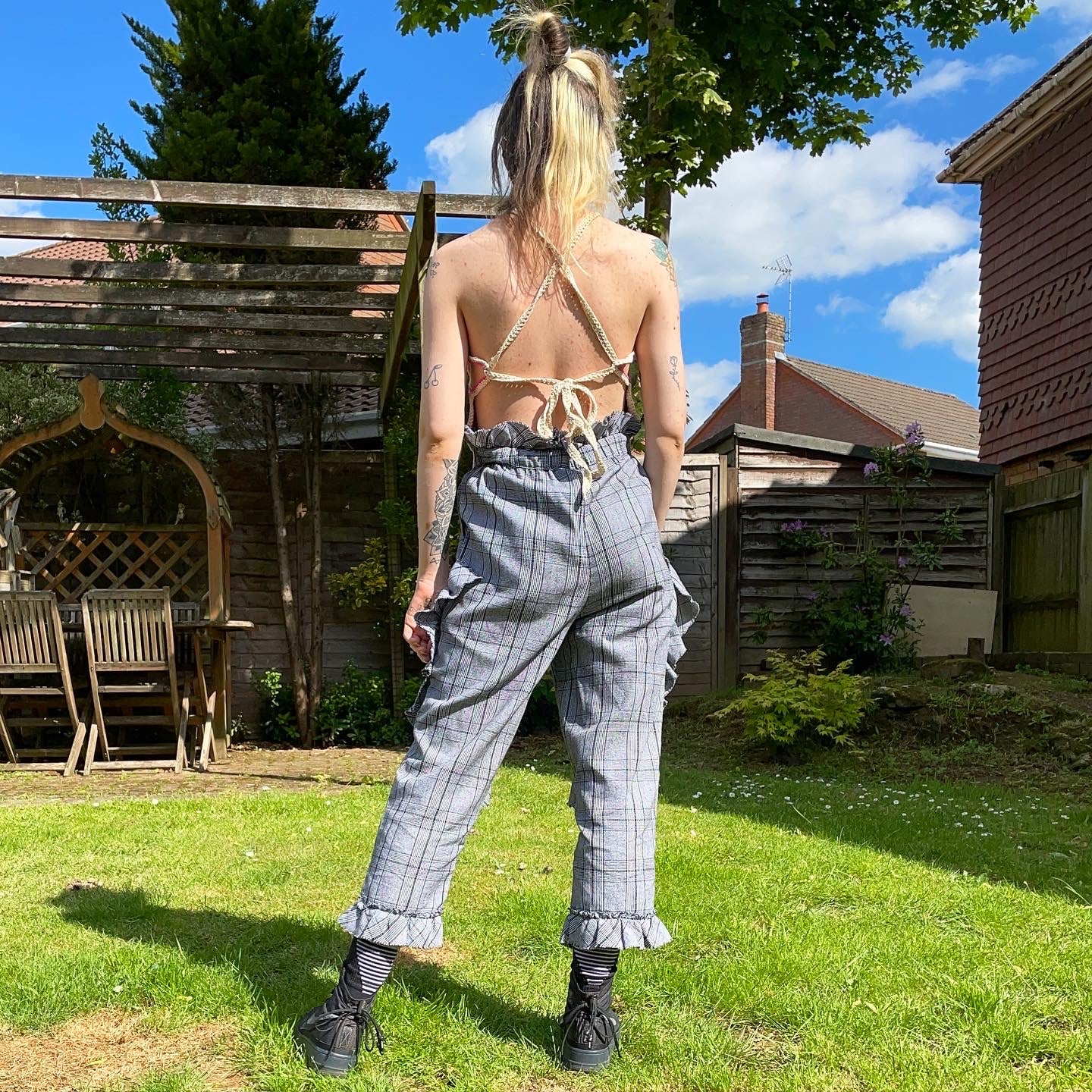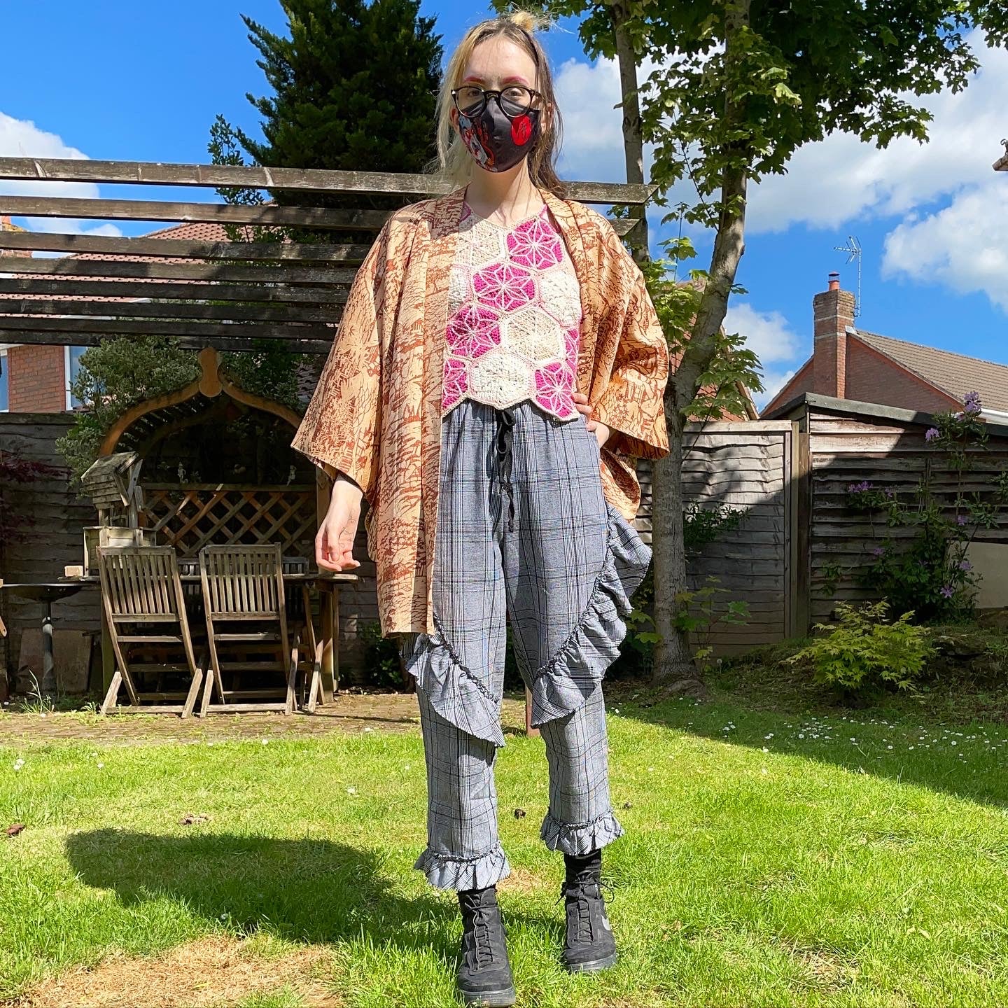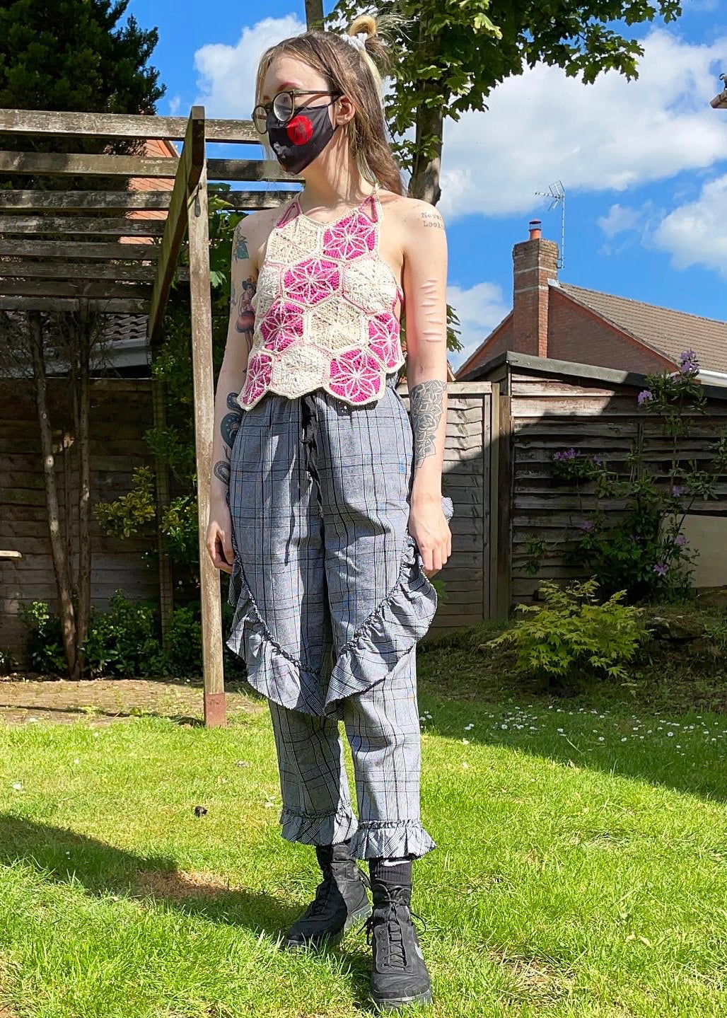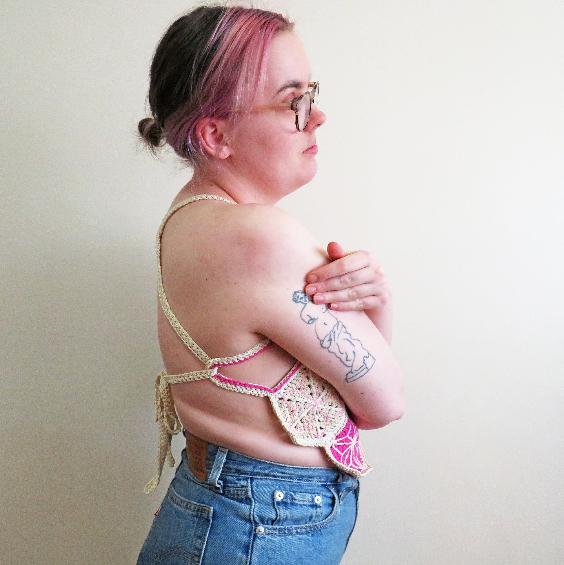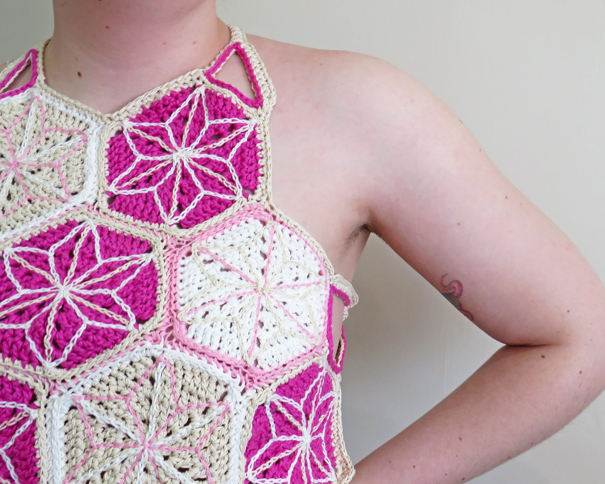 The top is made from joined hexagonal embroidered granny squares, in shade of pink, white and natural cotton, with small cutouts at the neck and the side. The top has loops at each side to thread the sturdy straps through to give the garment structure and adaptivity.