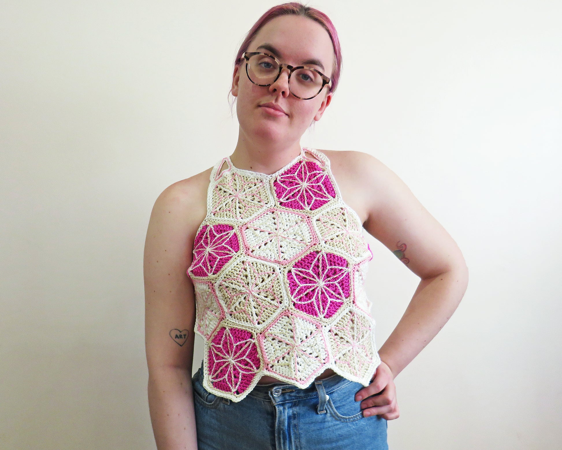 A unique crochet tie back top, inspired by the traditional Japanese asanoha (hemp leaf) print. This piece is made entirely from hexagonal granny squares, detailed with hand embroidery. This is my take on a pattern used for thousands of years.