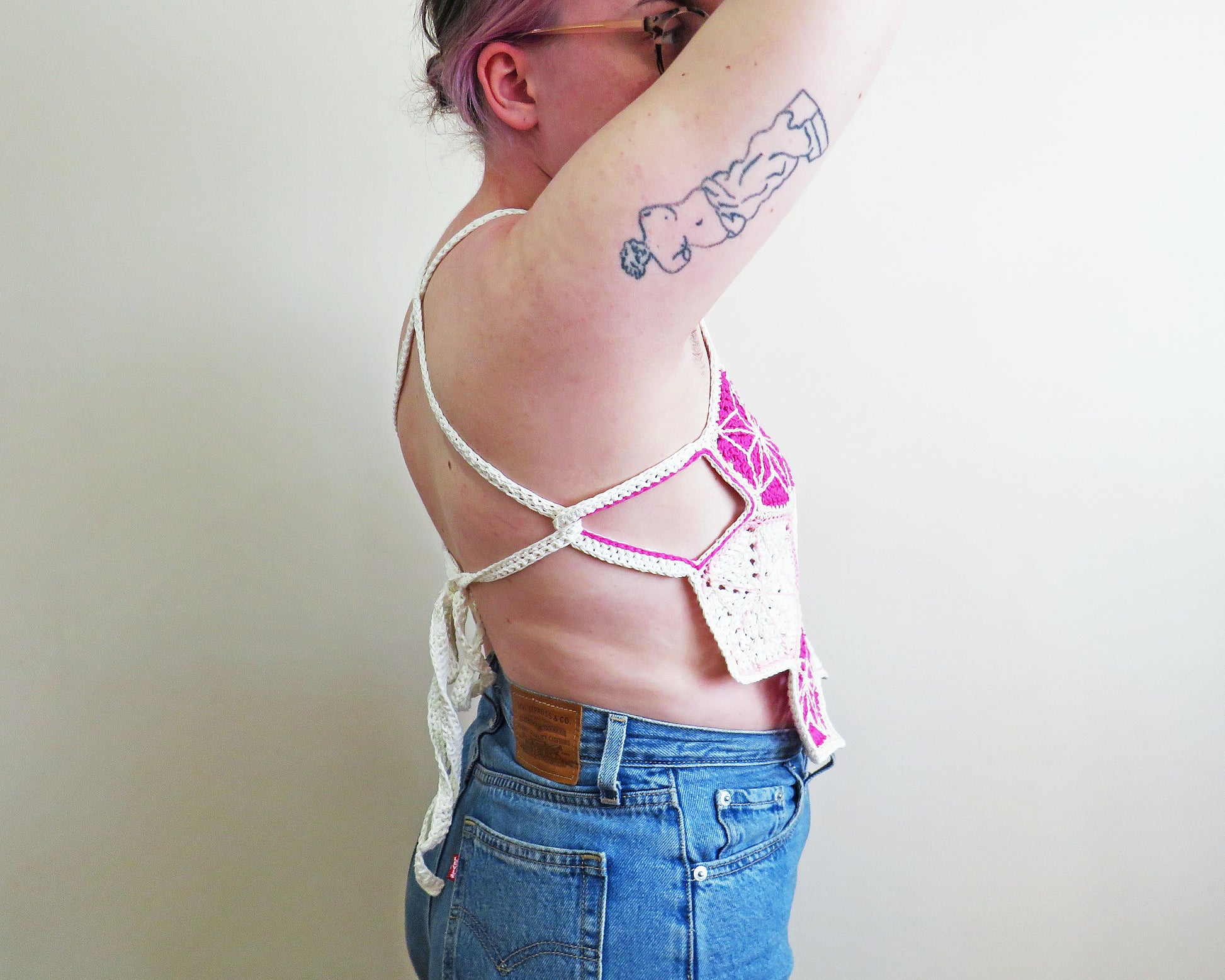 The top is made from joined hexagonal embroidered granny squares, in shade of pink, white and natural cotton, with small cutouts at the neck and the side. The top has loops at each side to thread the sturdy straps through to give the garment structure and adaptivity.