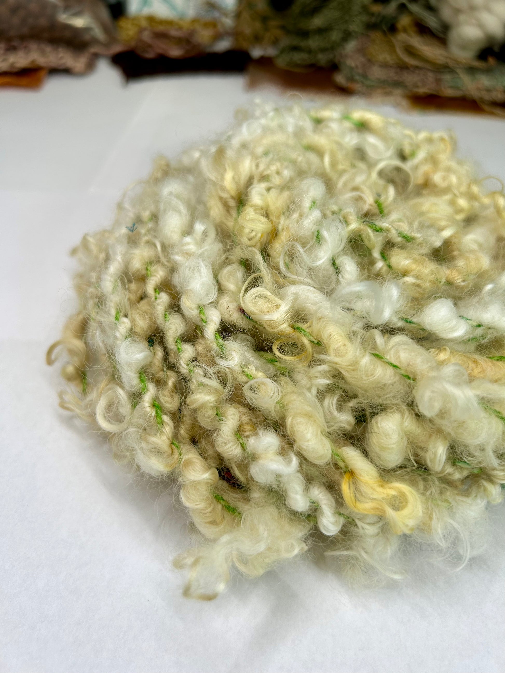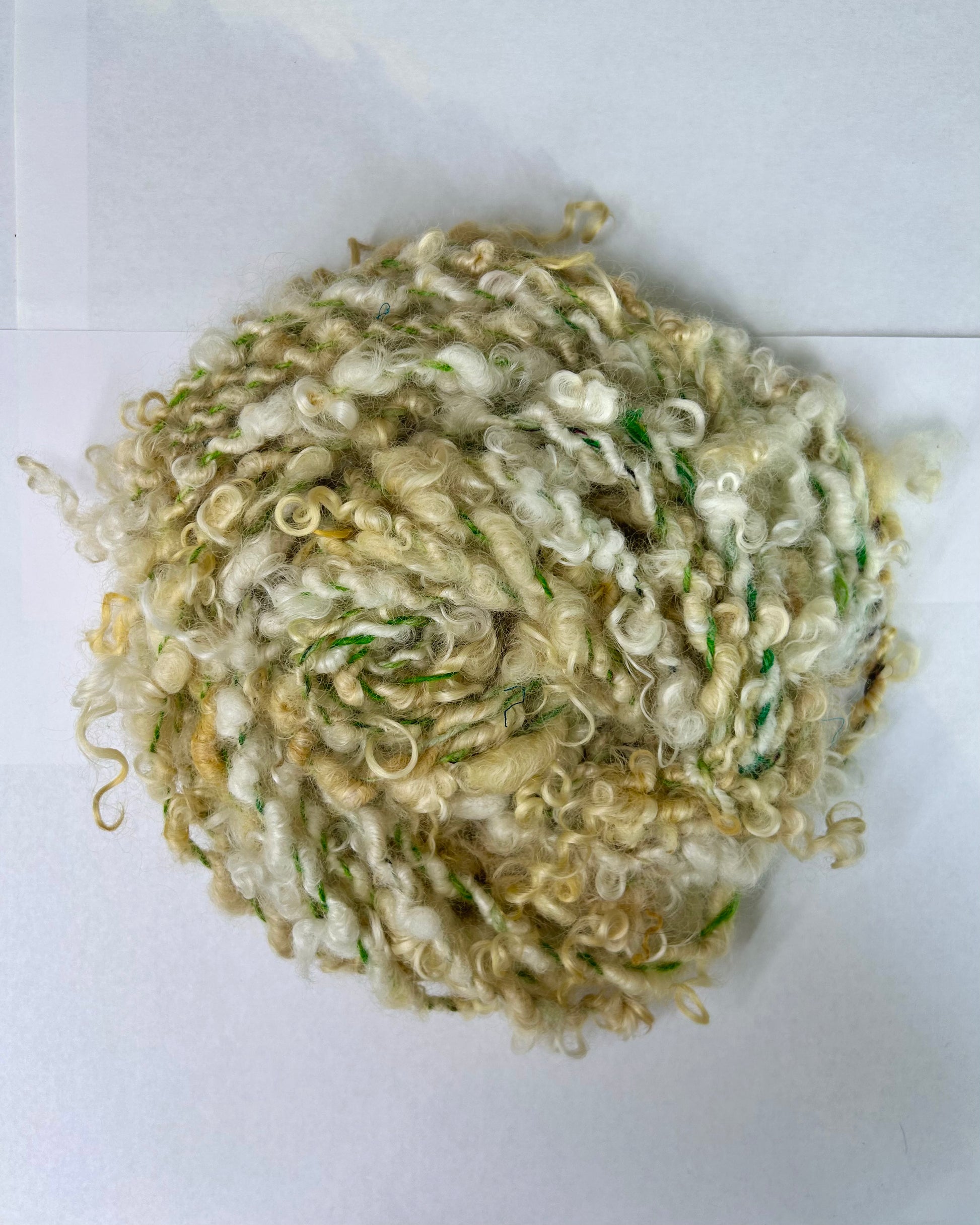 A beautiful fluffy skein of lock spun, naturally dyed Wensleydale wool. Dyed using marigold, spiral plied with blend of green sari silk and merino. Super chunky and luxurious, highlighting the naturally curly Wensleydale locks. Spun and plied on my beloved Ashford Spinning Wheel.