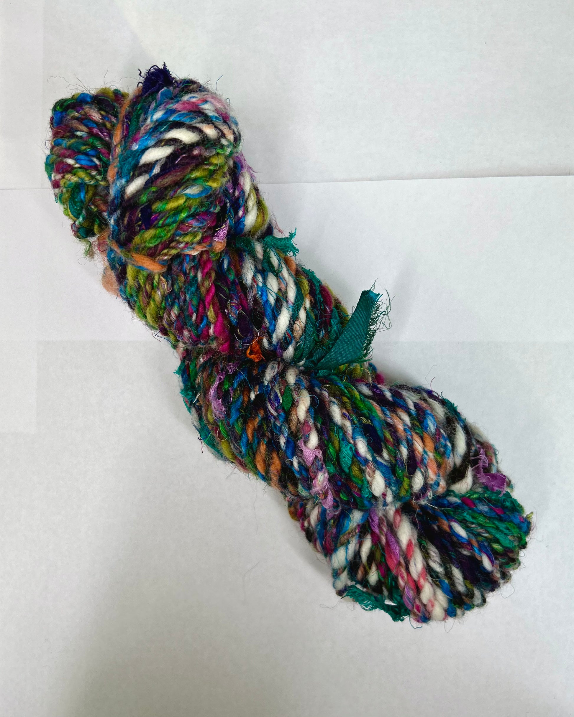 A beautifly blend of wools and silk with added ribbon. Spun from merino and shetland wool with sari silk. A worsted spun yarn that is understated but stunning. Spun and plied on my beloved Ashford Spinning Wheel.