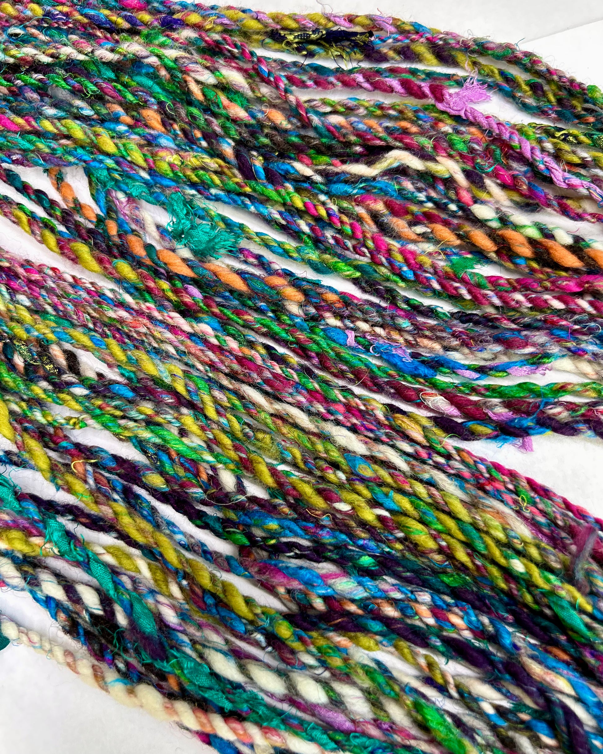 'Forget-me-not' merino, sari silk, shetland and ribbon add ins; chunky 2ply (103g)
