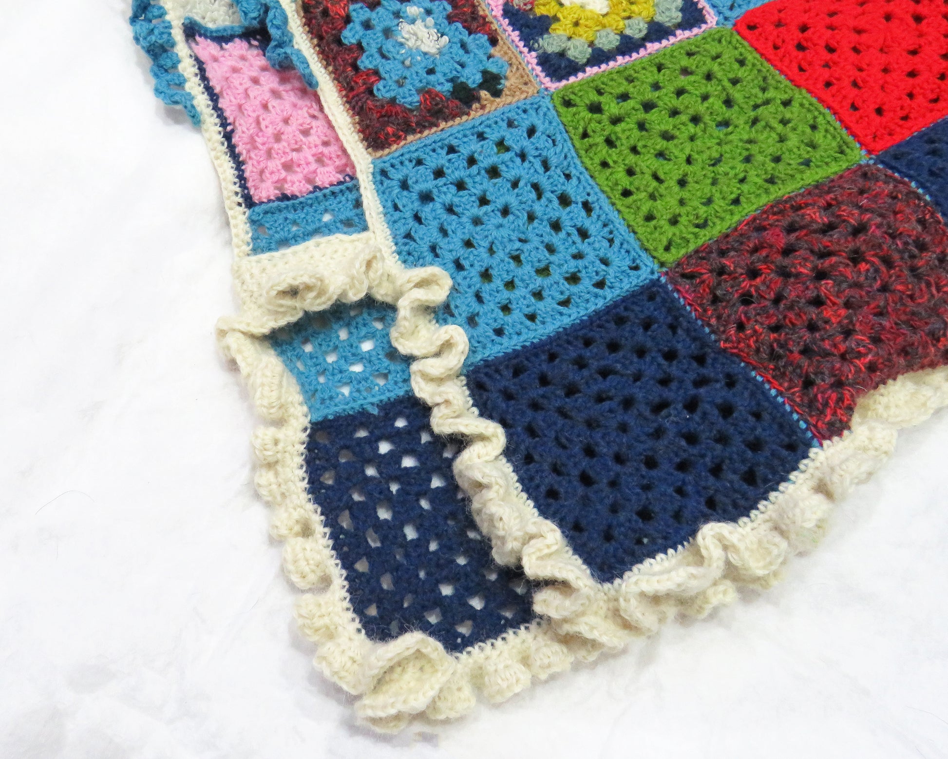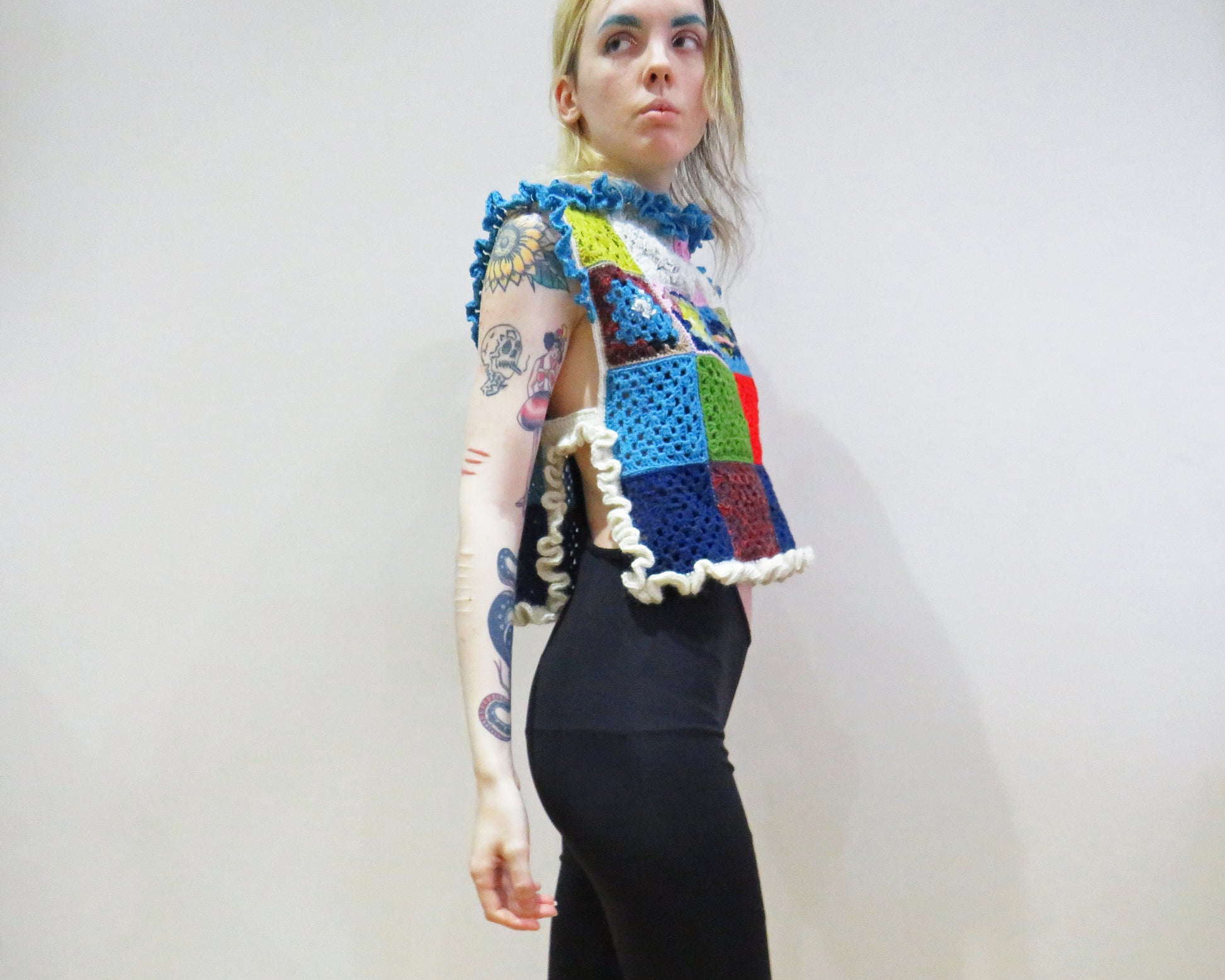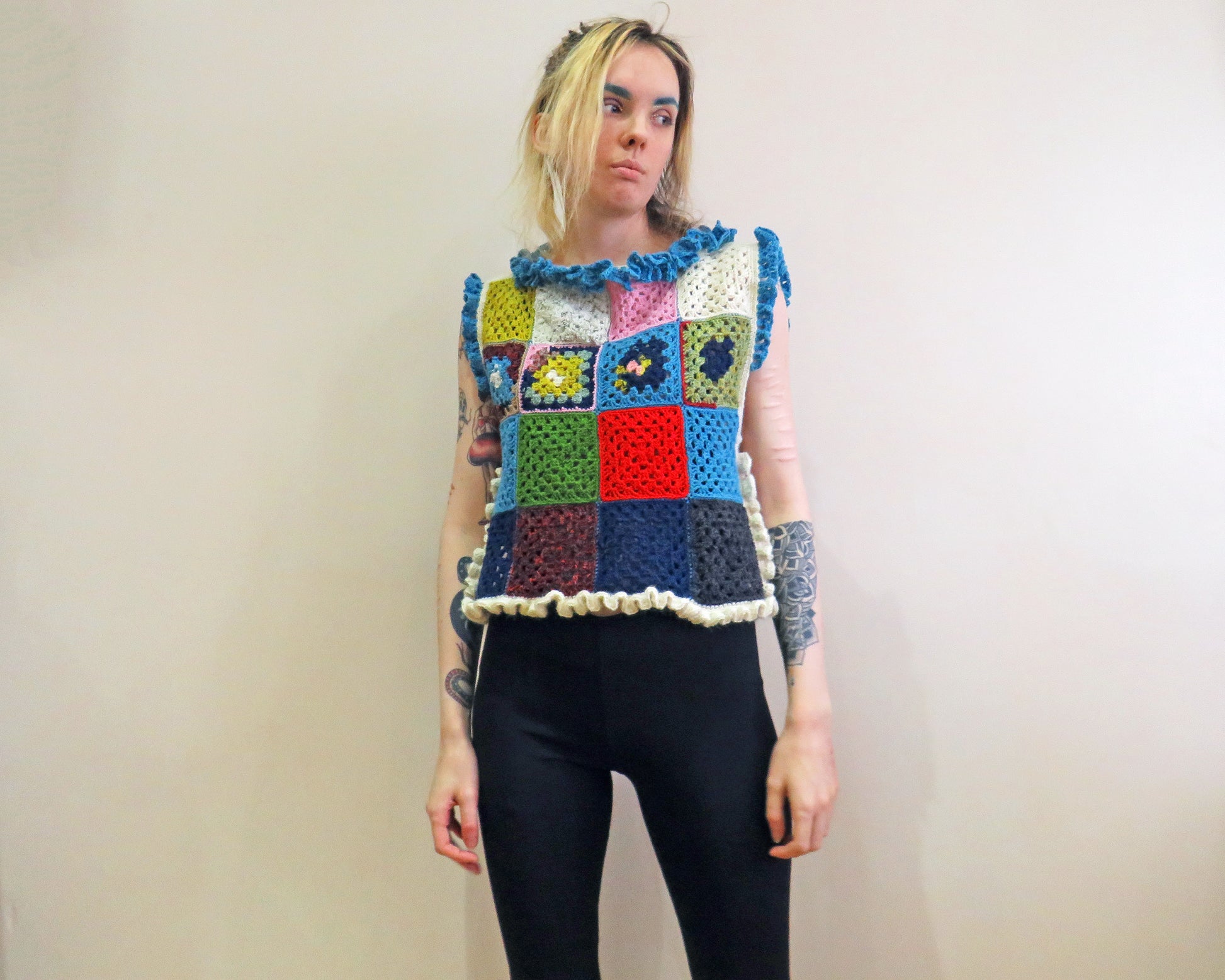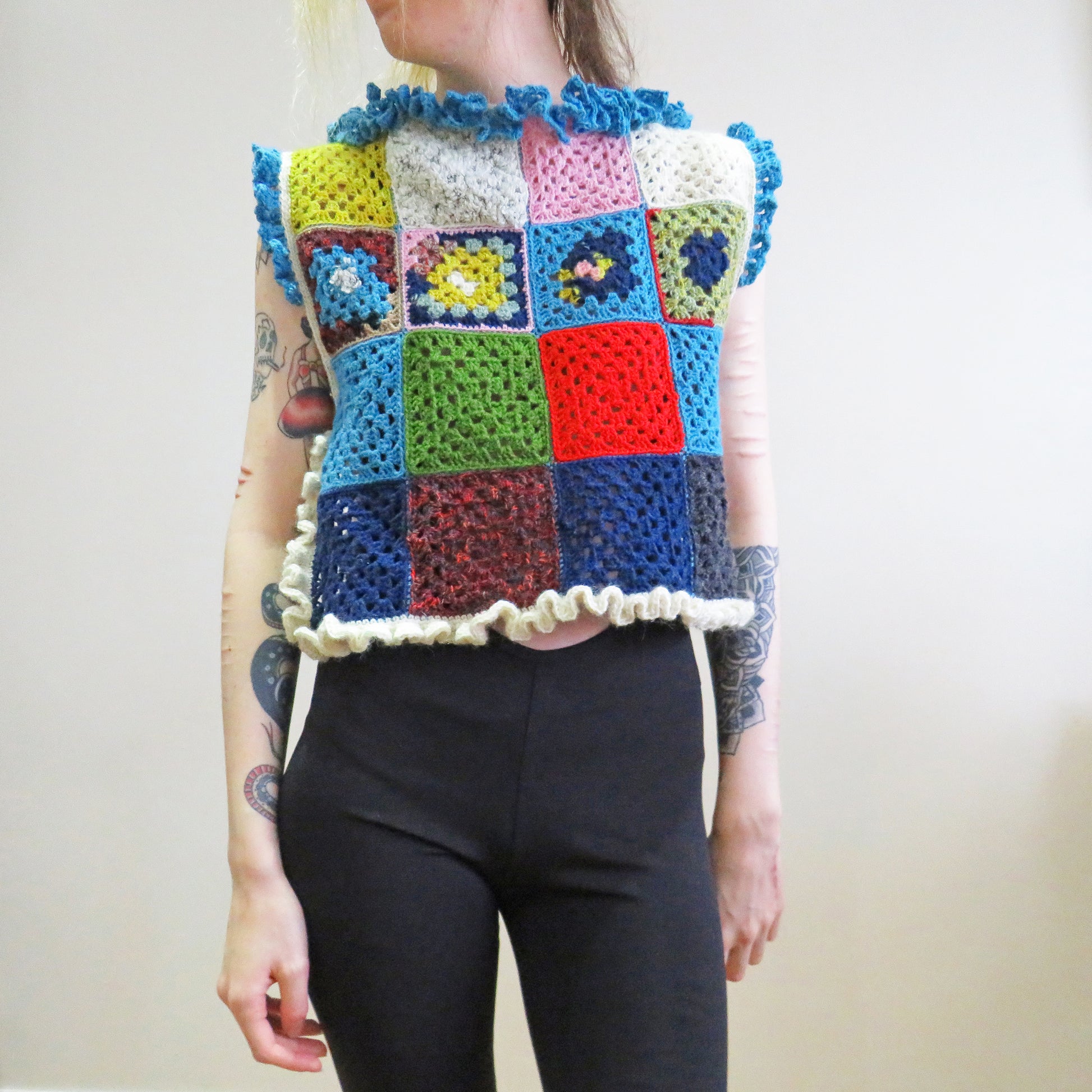The sweater vest is made from joined granny squares with an exaggerated ruffle neck. The side seams are open and ruffles run around the entire bottom of the vest. There are faux capped sleeves also made from crocheted lace ruffles.
