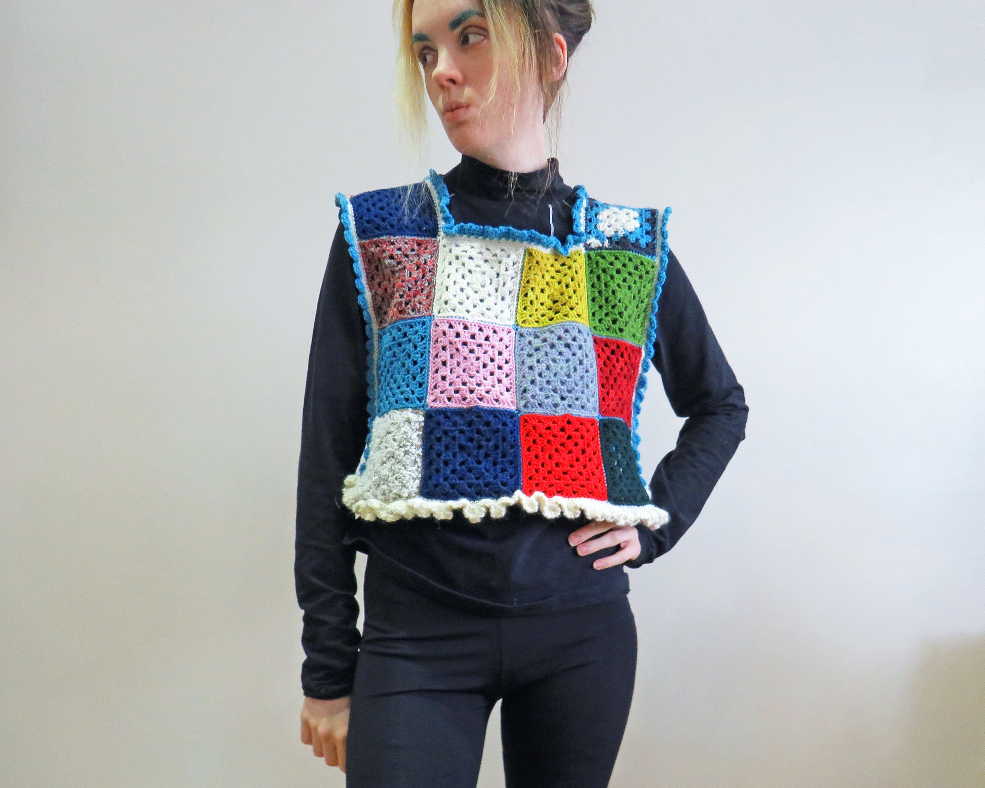 The sweater vest is made from joined granny squares with ruffles around the neck and hem. They run around the arm holes and down through to the hem on both sides. The neck is a simple square neck.
