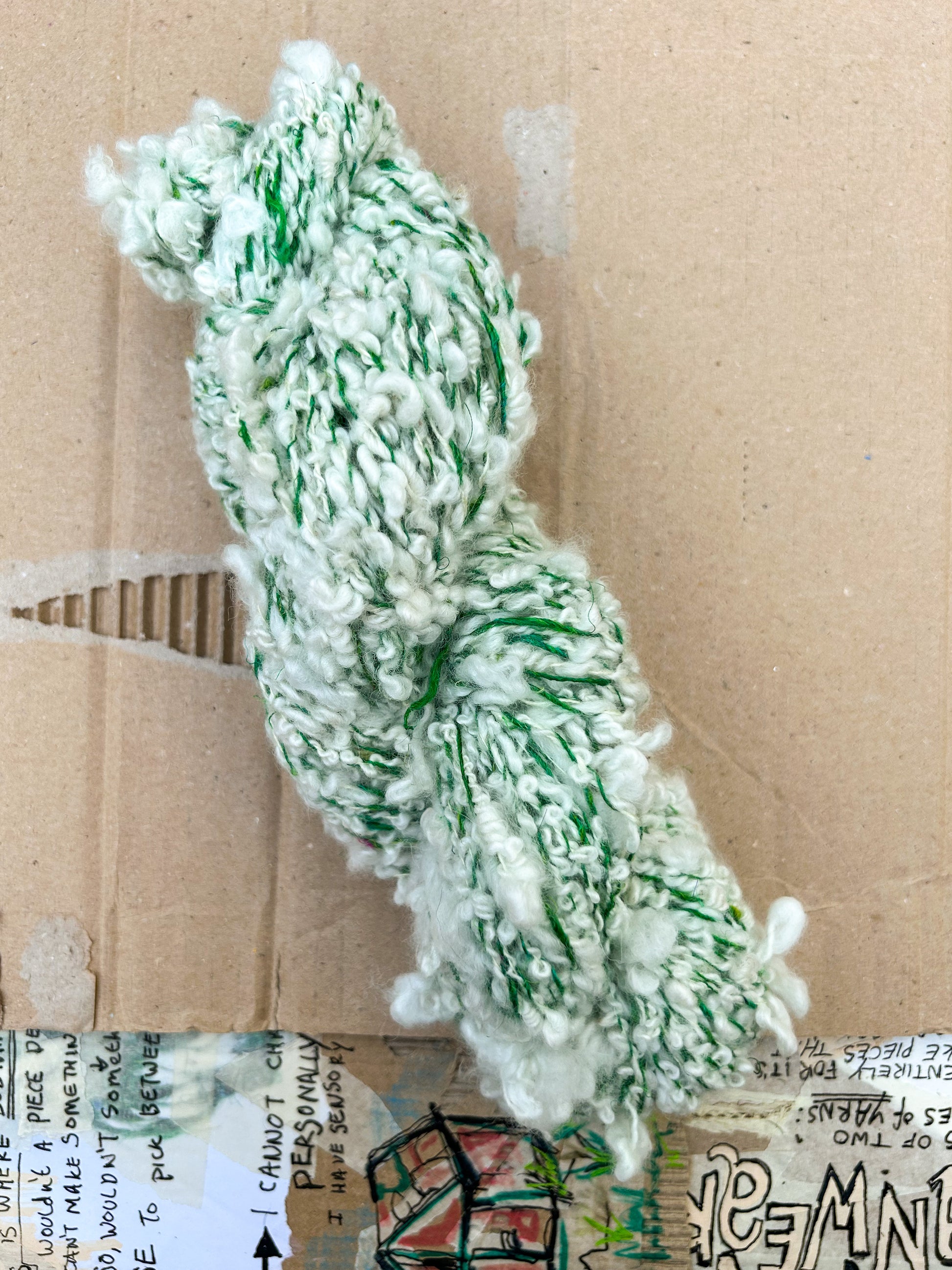 A balanced clump style Bouclé (3ply), 60% Undyed Baby Alpaca. 20% Tussah silk and 20% Sari silk yarn, spun on my beloved Ashford Spinning Wheel.