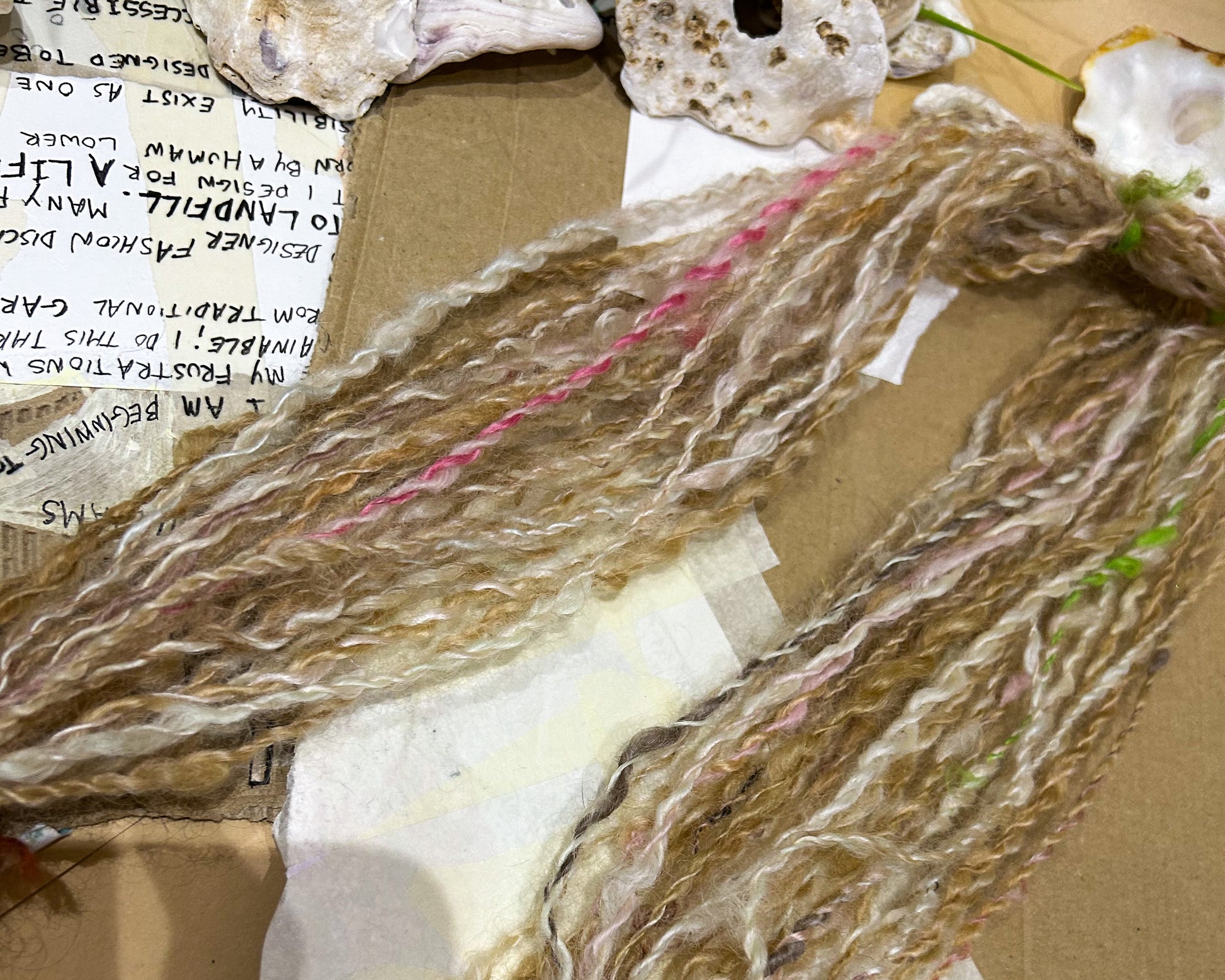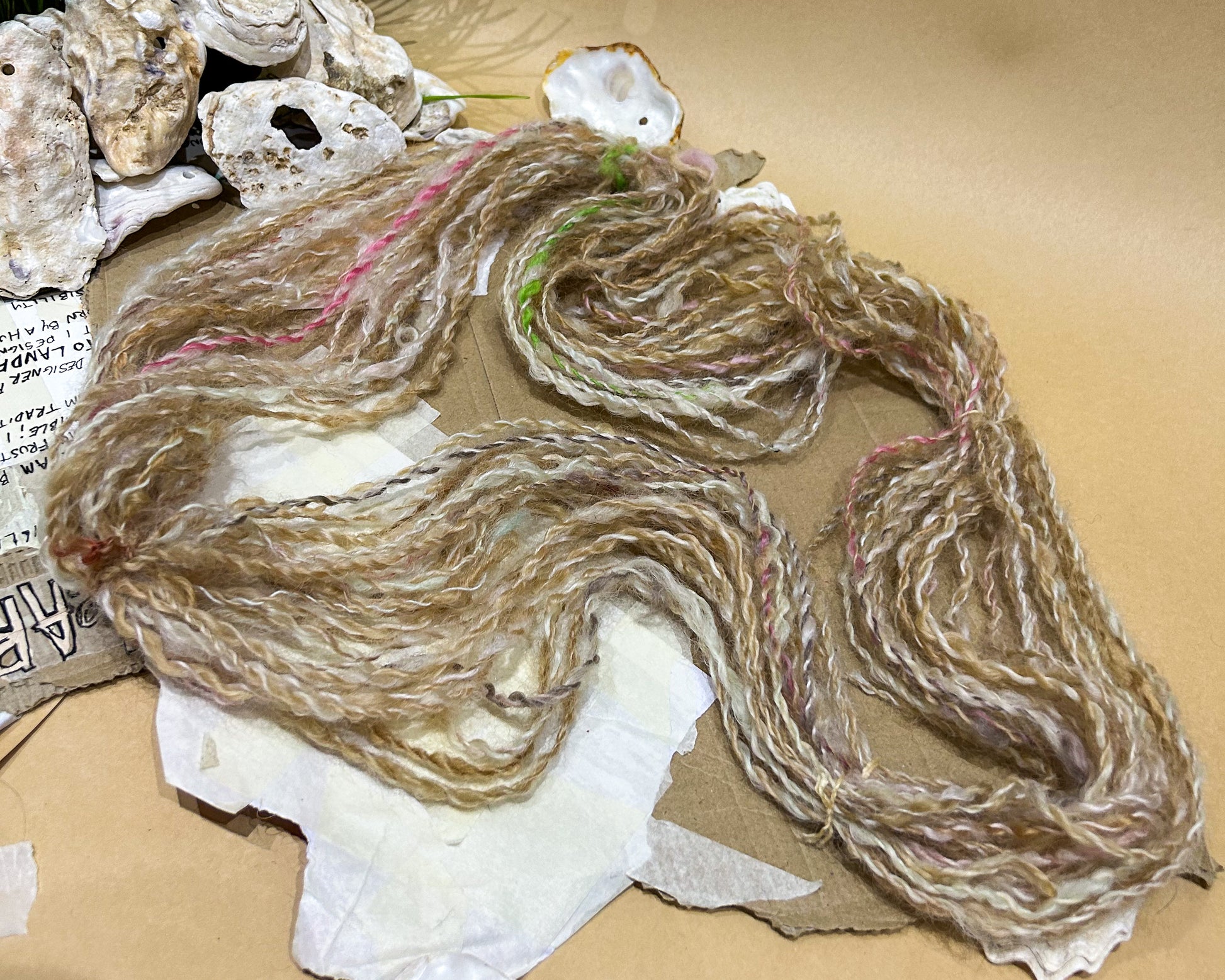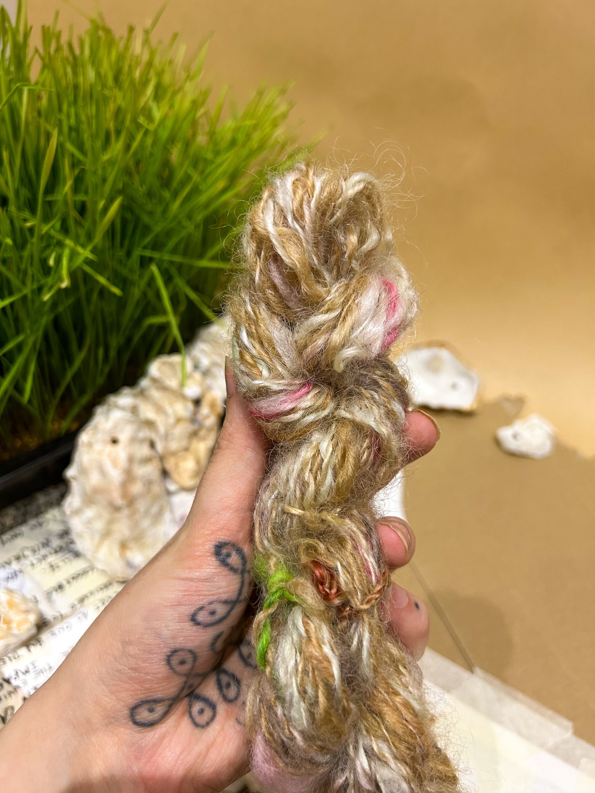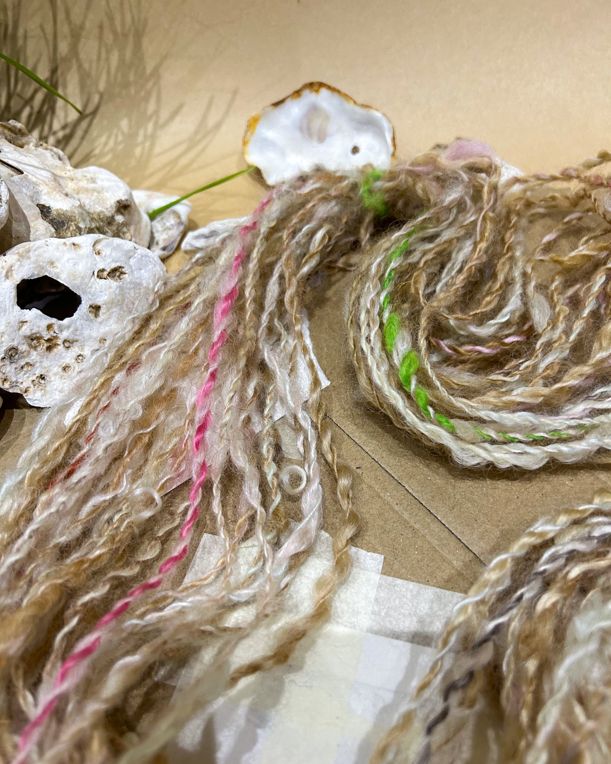 A beautiful 2ply autumnal blend of teeswater wool in browns, pinks and white with an accent of green. Spun from dyed and natural teeswater locks. A woolen spun yarn that is understated but stunning. Spun and plied on my beloved Ashford Spinning Wheel.