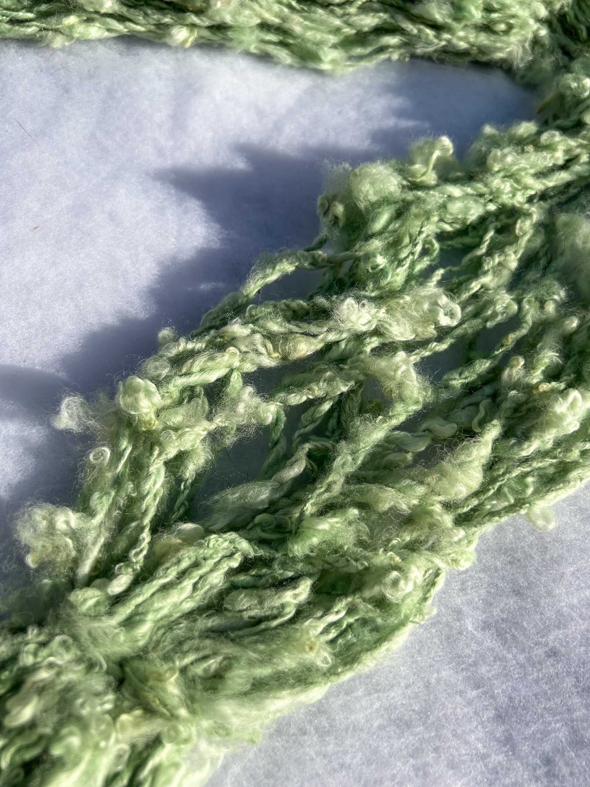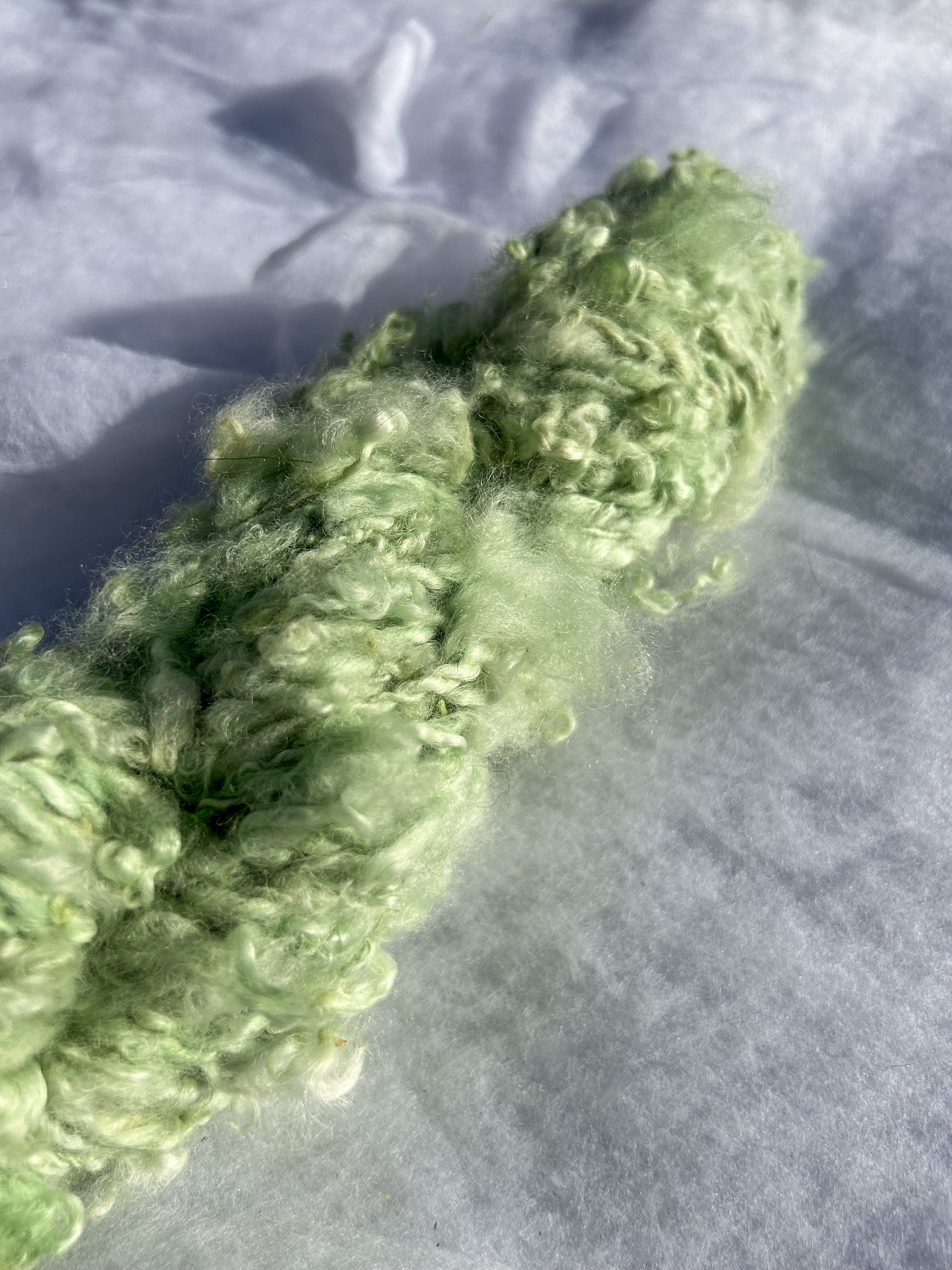 A Unique balanced Lock/tail spun 2ply, Naturally Dyed Green (Chlorophyllin Powder) Baby Alpaca yarn, spun on my beloved Ashford Spinning Wheel.