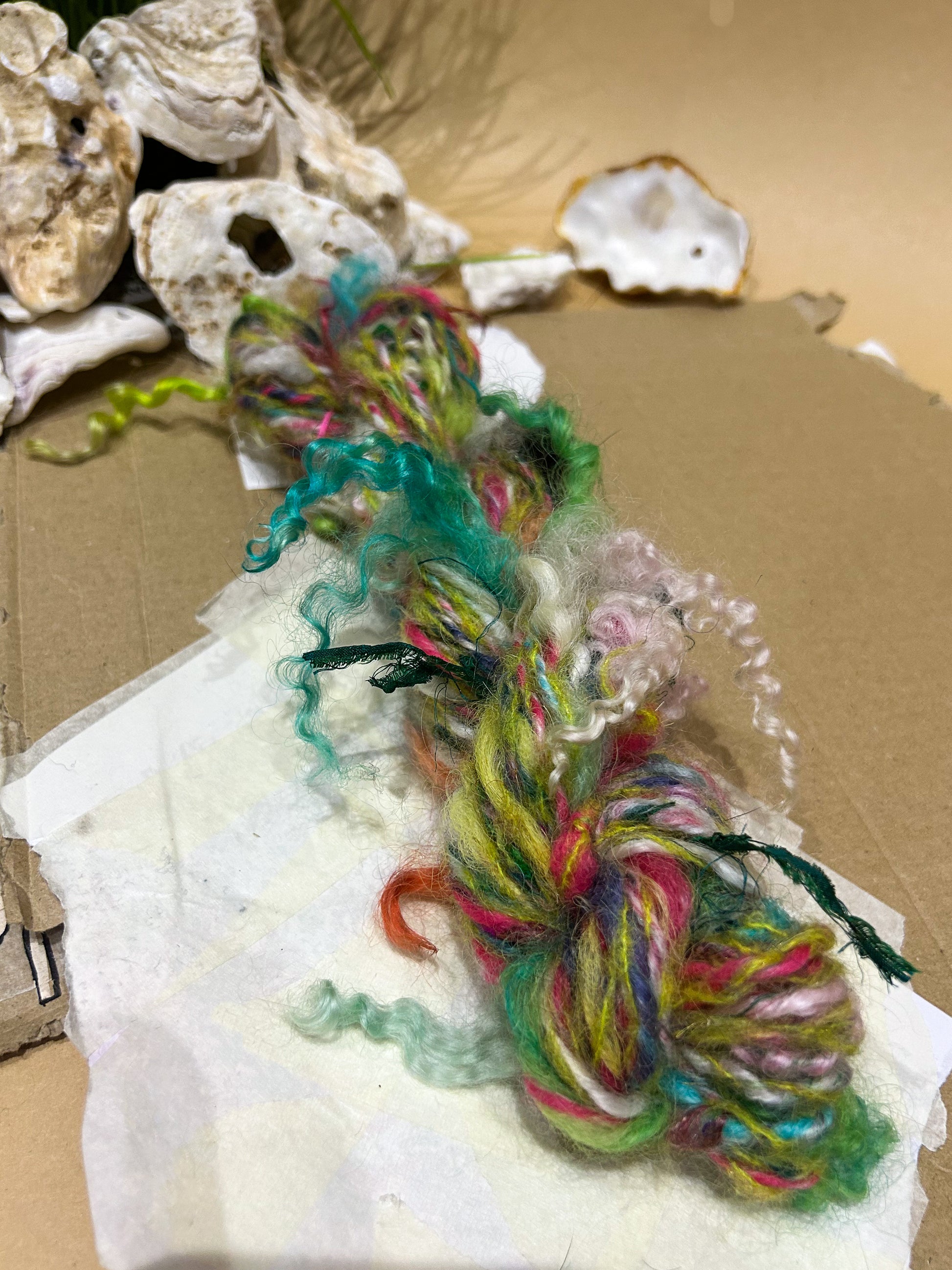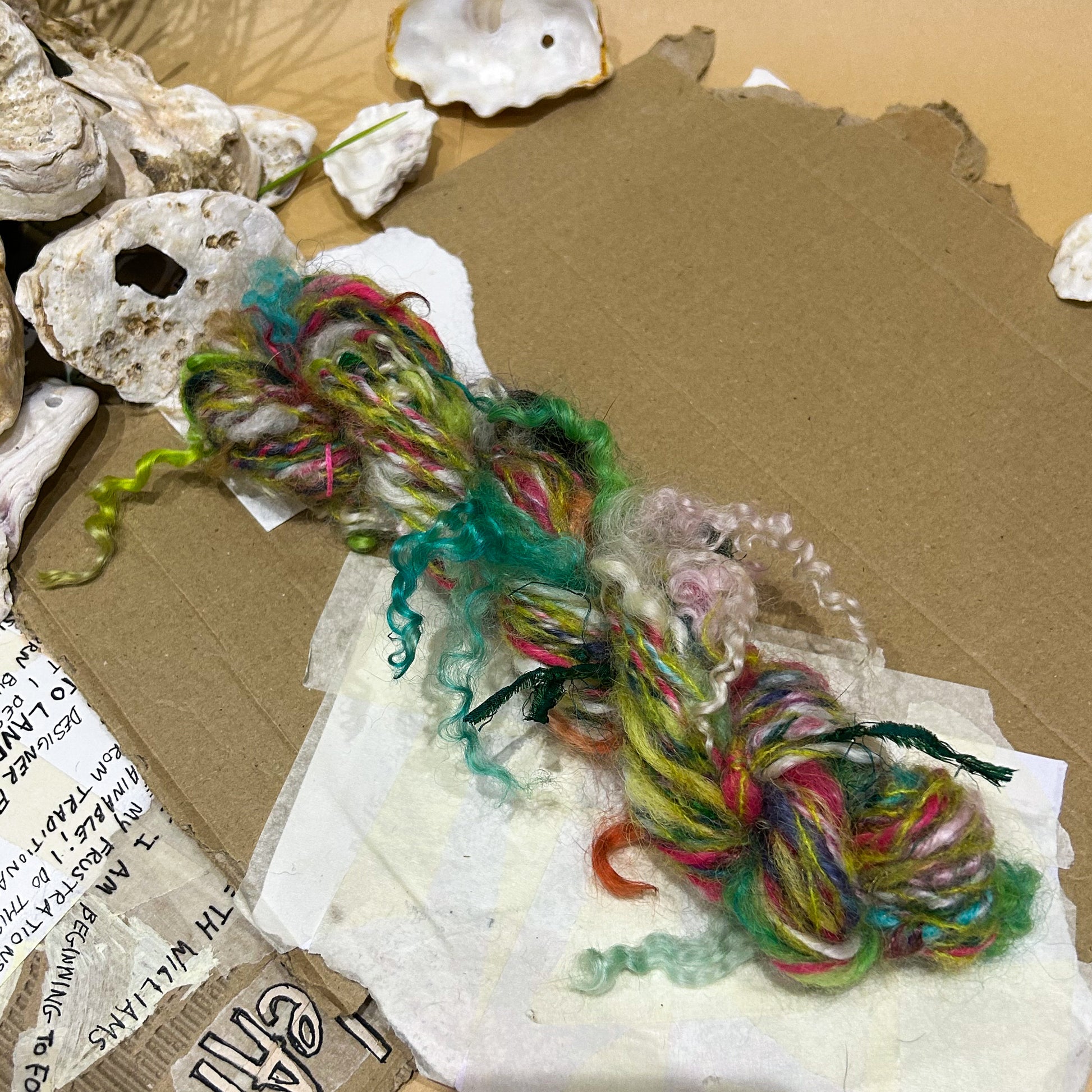 A funky and exciting rainbow skein. Spun from a teeswater, merino, sari silk and alpaca art batt, that has been plied with a lime green commercial mohair. With added teeswater locks and sari silk ribbon for extra textural fun. Woolen spun then plied on my beloved Ashford Spinning Wheel.