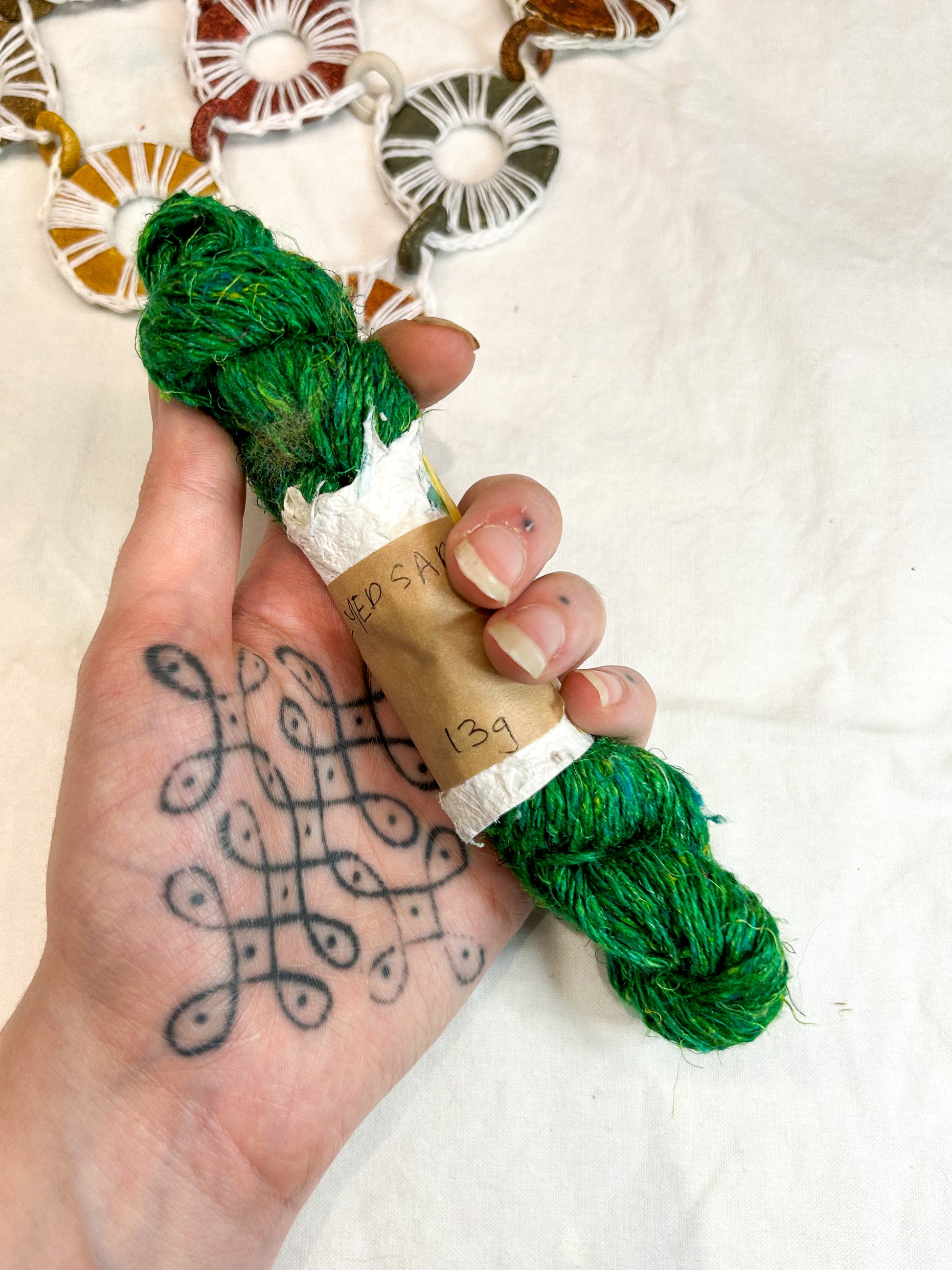 Sari silk is move textured than cultivated silks, giving the yarn a unique texture. It soft and luxurious. Perfect for any textile art. From crochet, to knit, to weave.