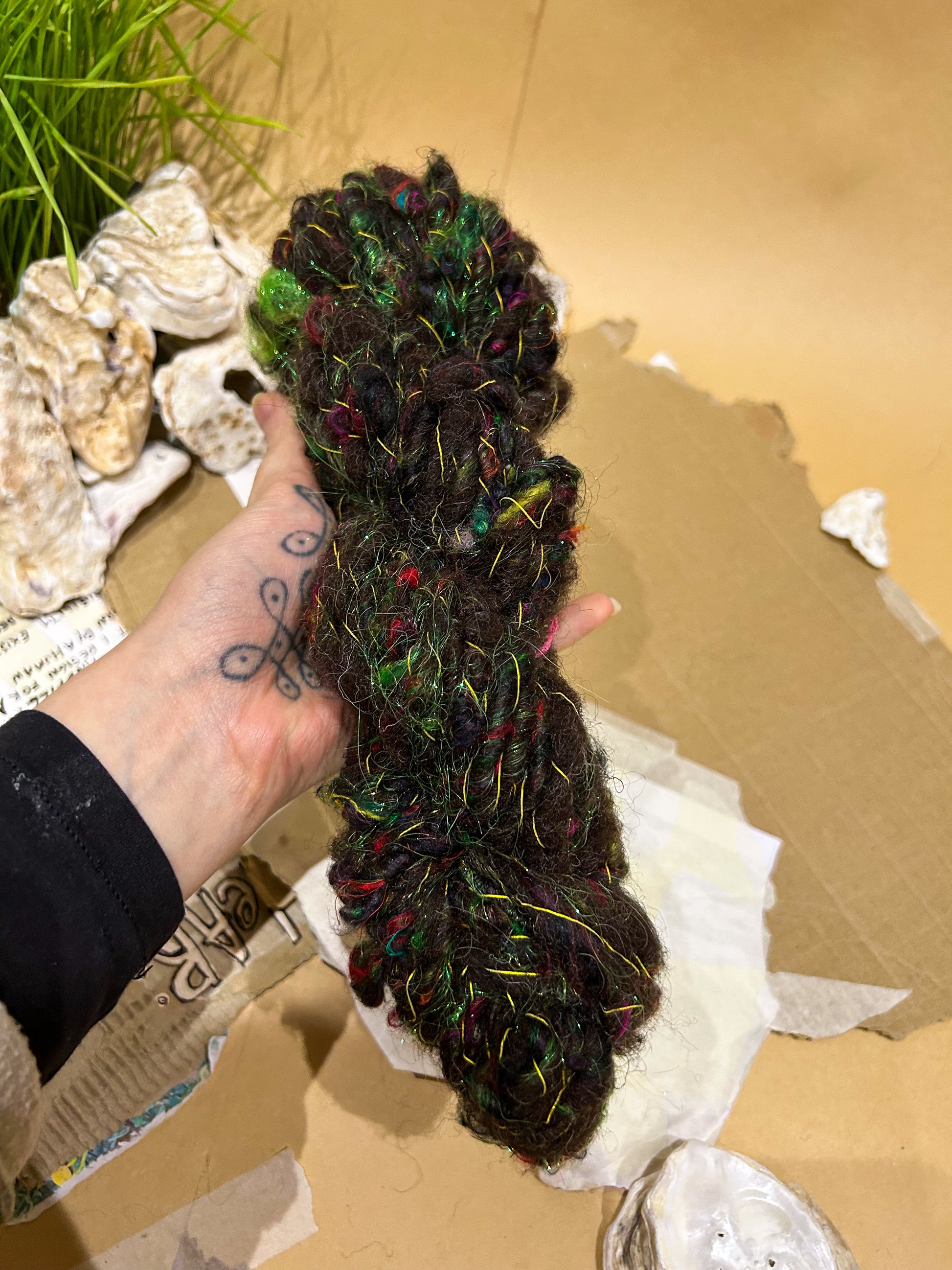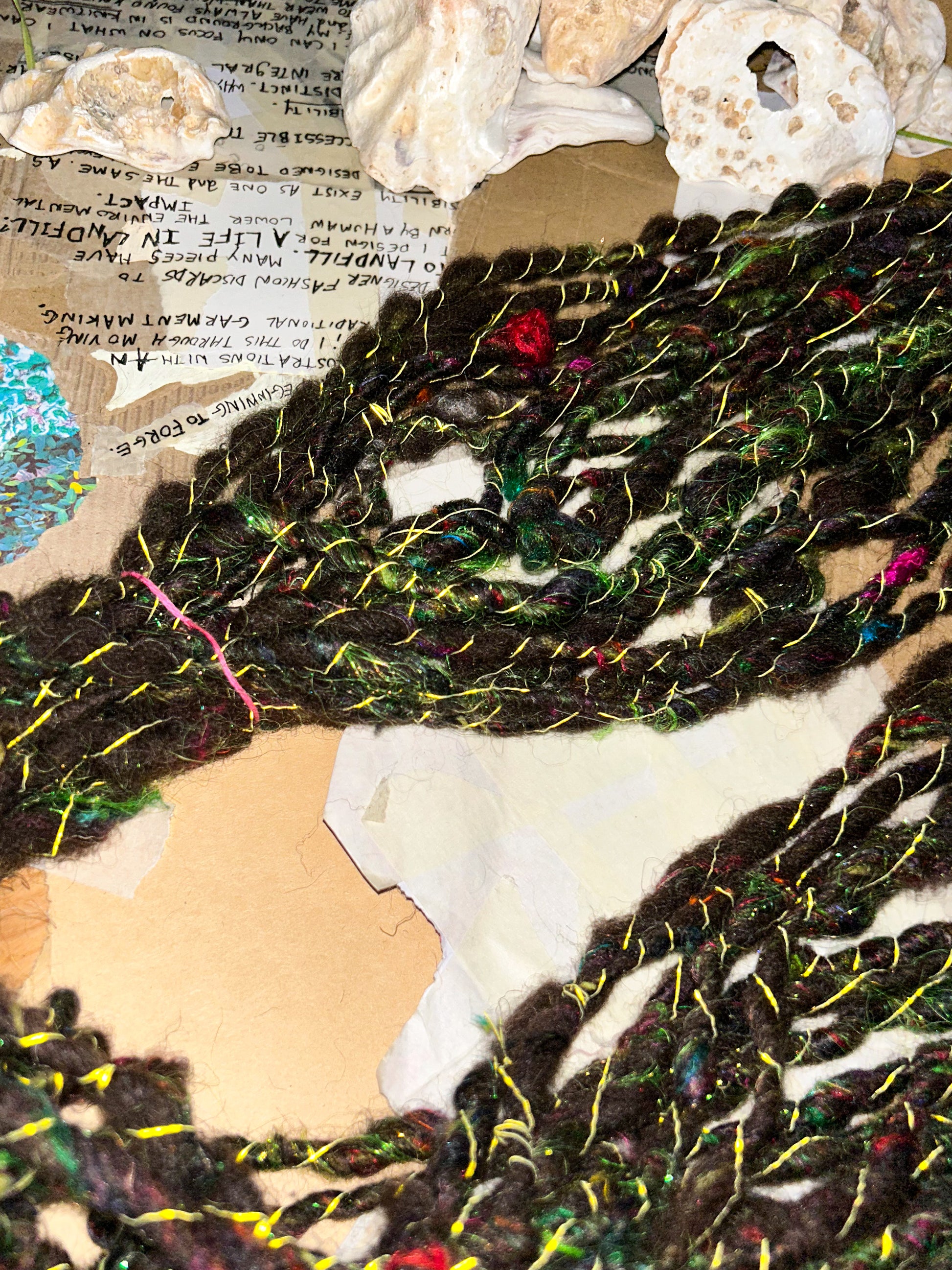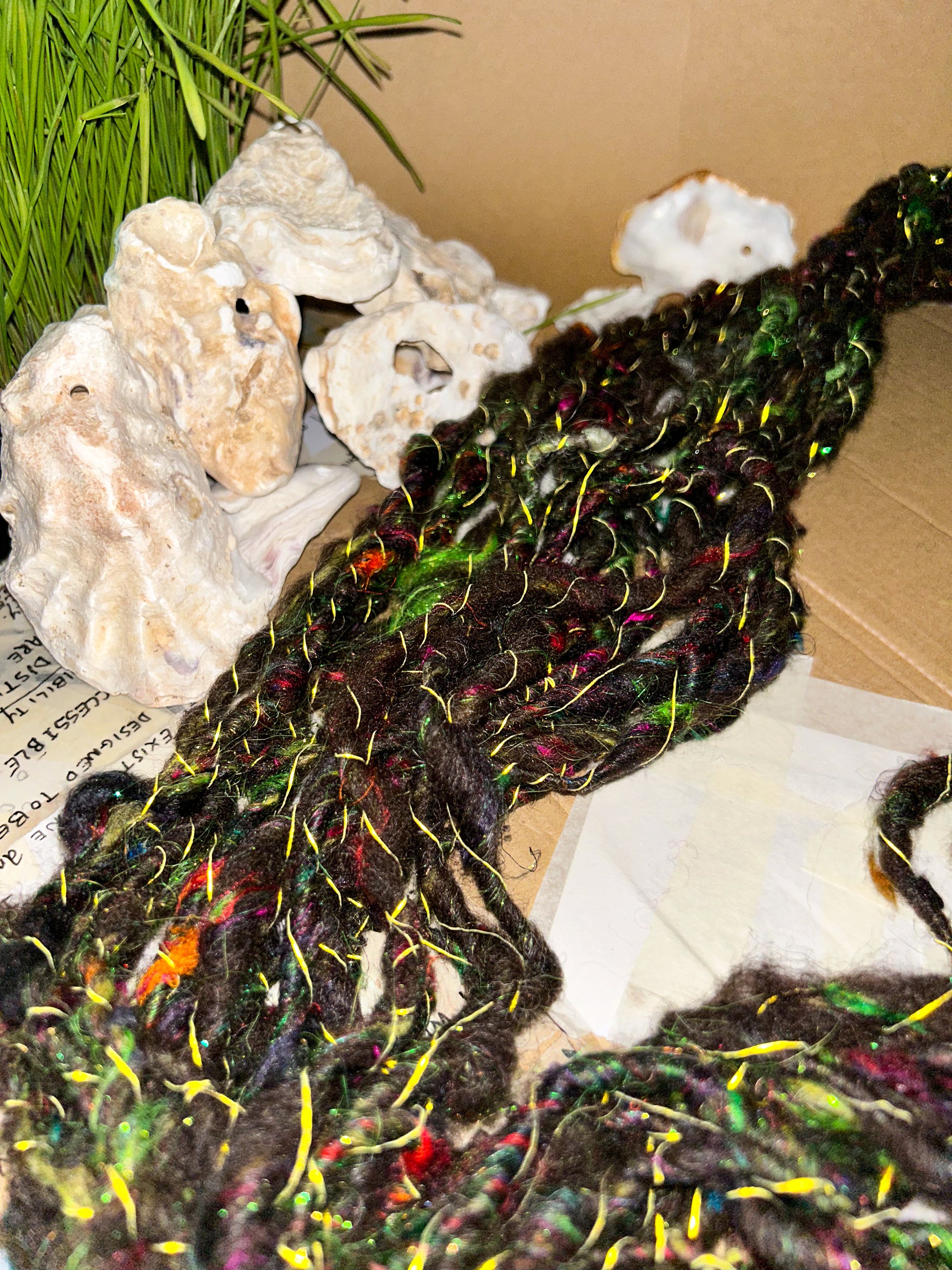 A chunky and funky disco art yarn. Spun from a blend of shetland wool and sari little angelina fibre with a mohair core and Reflective yellow Lurex Wrapping. Spun on my beloved Ashford Spinning Wheel.