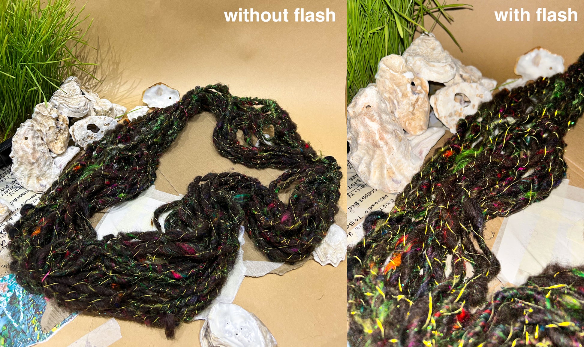 Due to how chunky and textural it is this yarn would be best suited for weaving, weaving into knit/crochet, or for using with chunky needles/hooks.