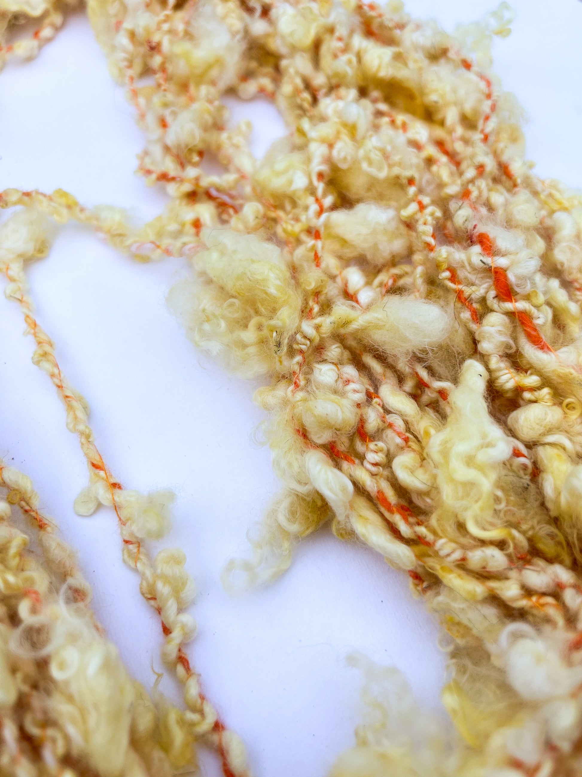 A Unique chunky Lock/Tail spun Bouclé (3ply), 75% Naturally Dyed (Safflower) Baby Alpaca, 20% Merino Wool and 5% Italian silk yarn, spun on my beloved Ashford Spinning Wheel.