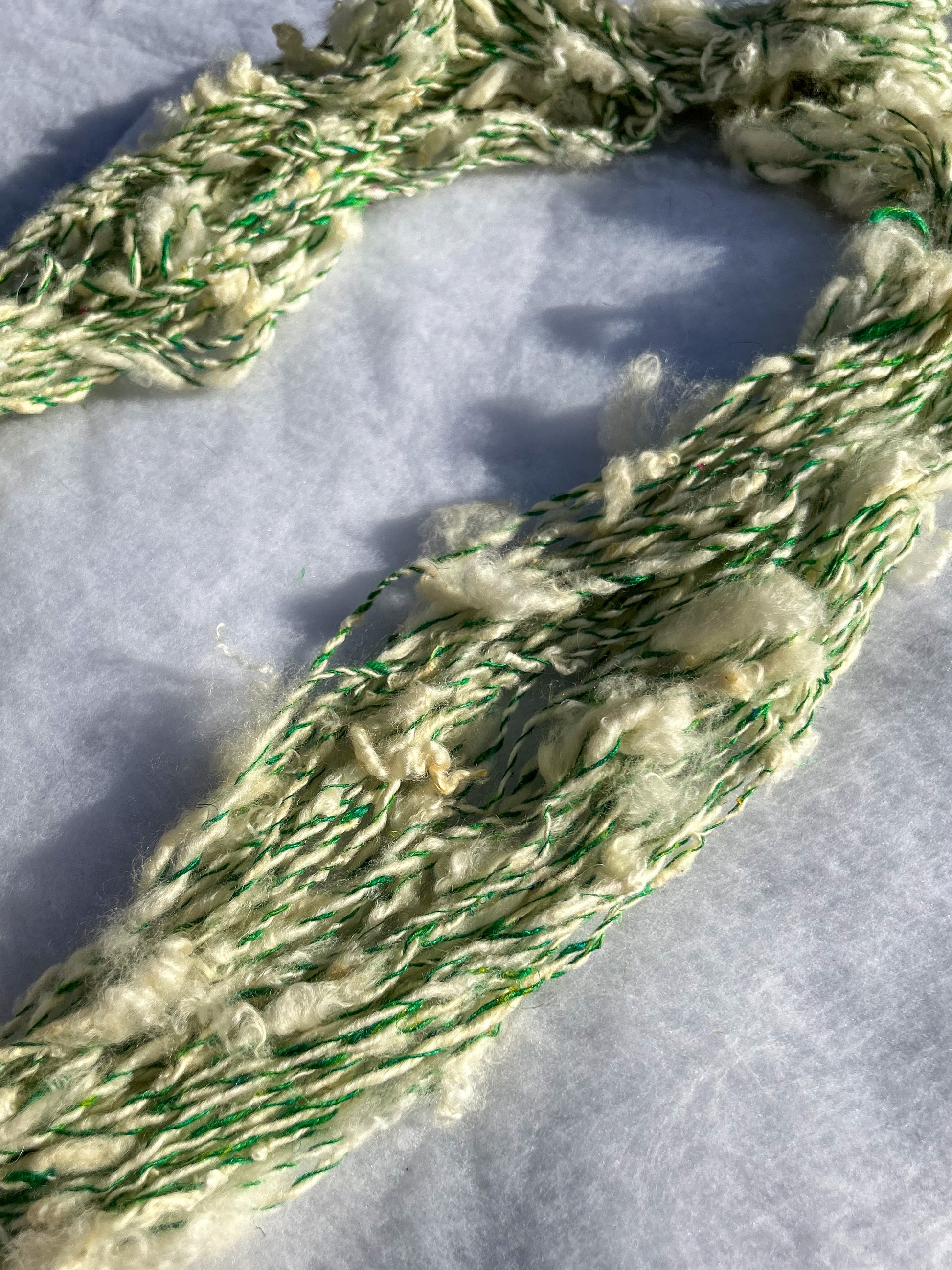 This skein is 65g in weight. The alpaca is lock spun and dyed with seaweed, it was then plied with green sari silk. Silk that is the waste product created during sari making.
