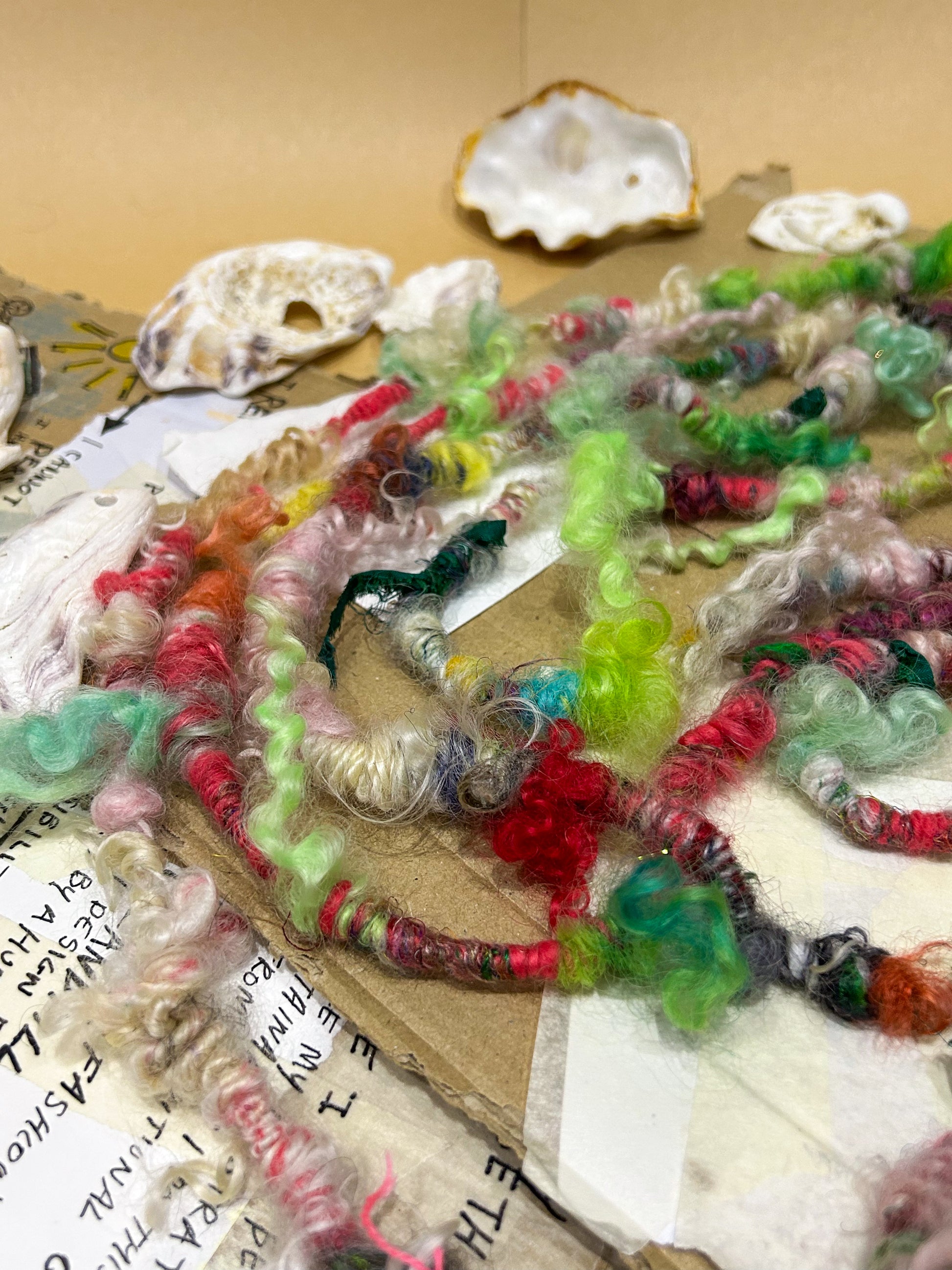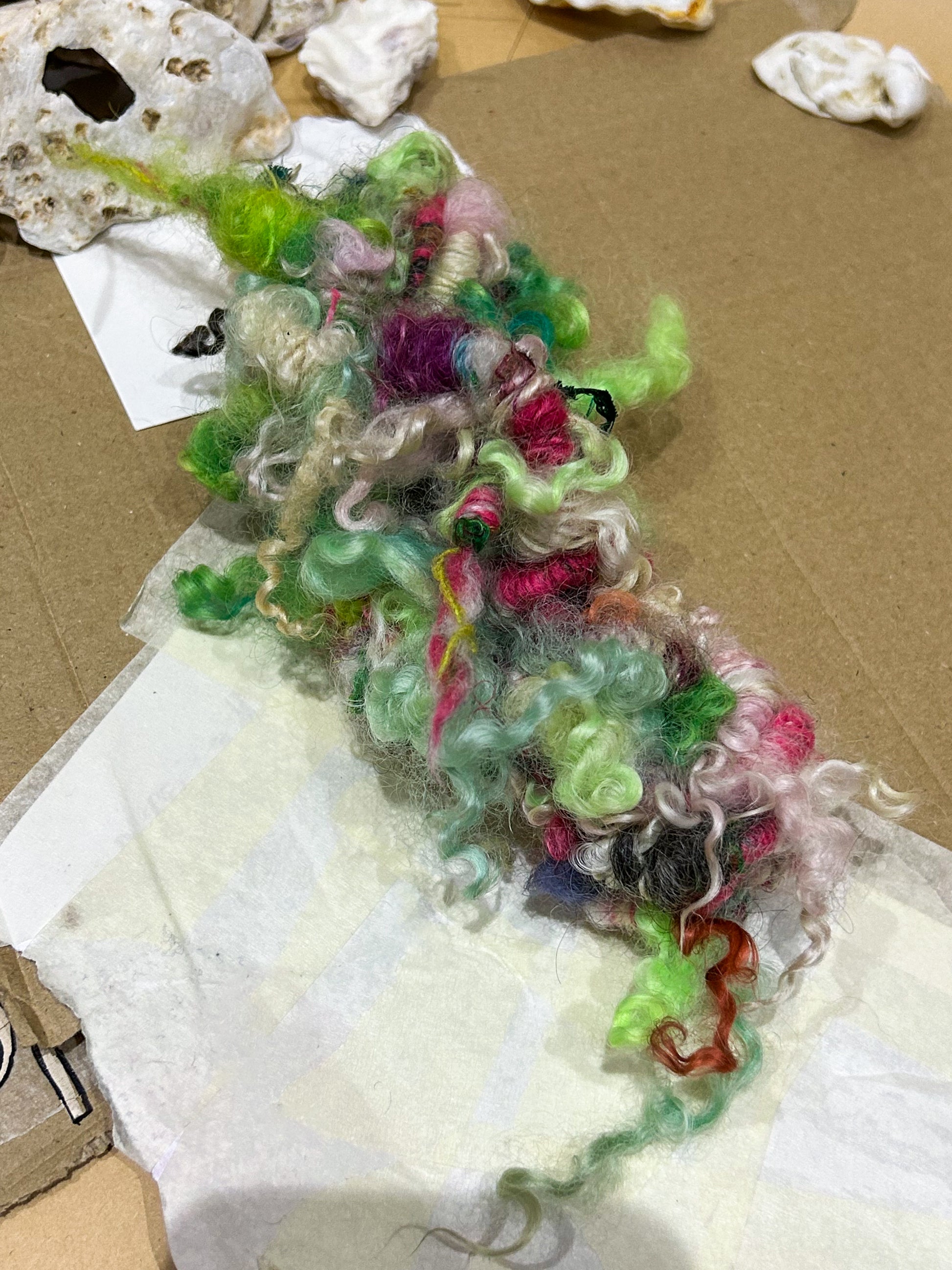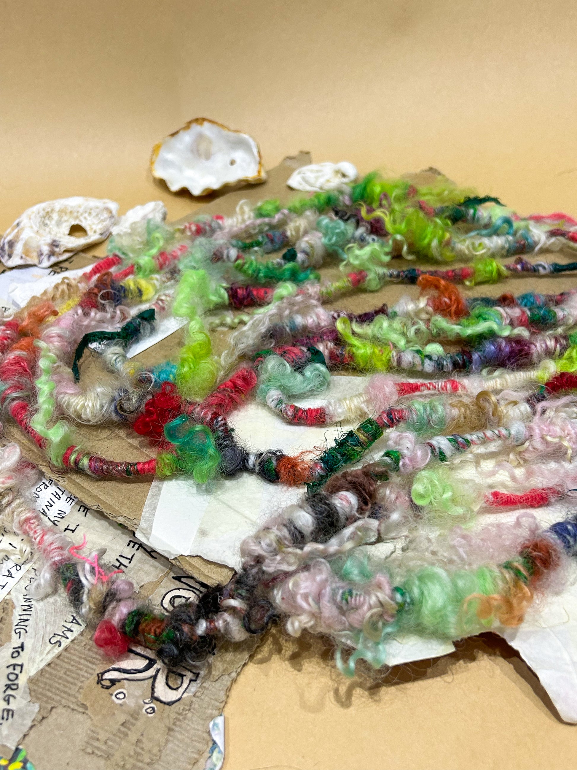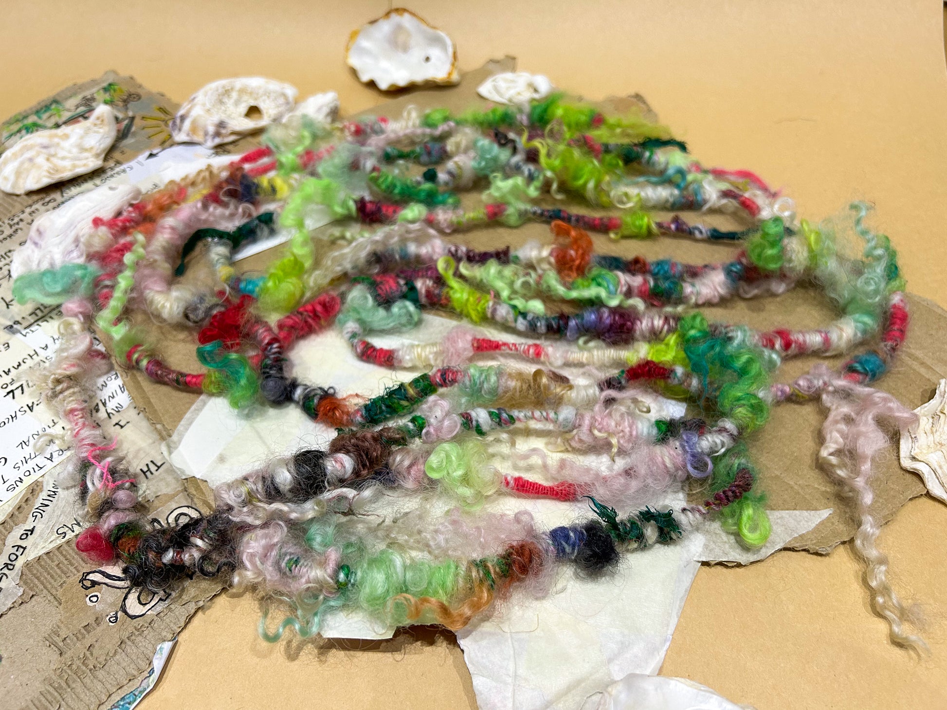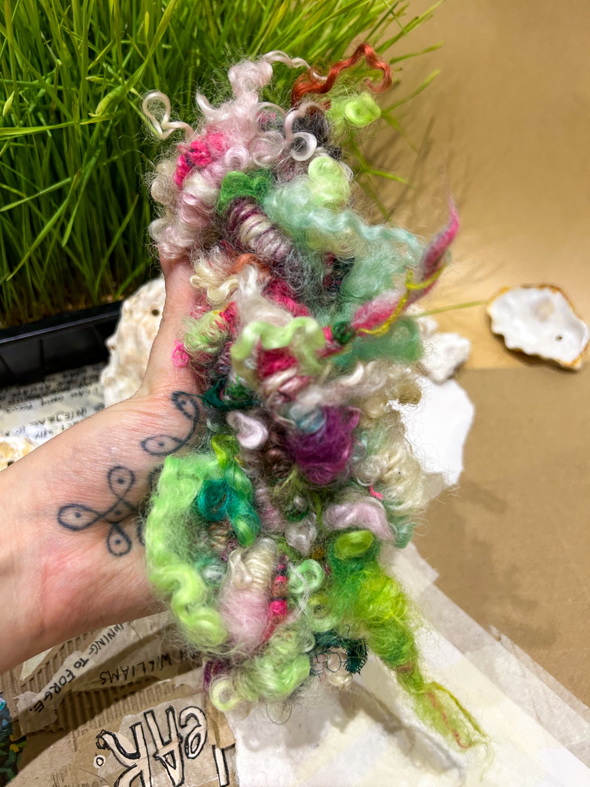 A chunky and funky supercoiled art yarn. Spun from a blend of teeswater, merino, sari silk and alpaca, with added in sari silk ribbons and teeswater locks. Spun on my beloved Ashford Spinning Wheel.