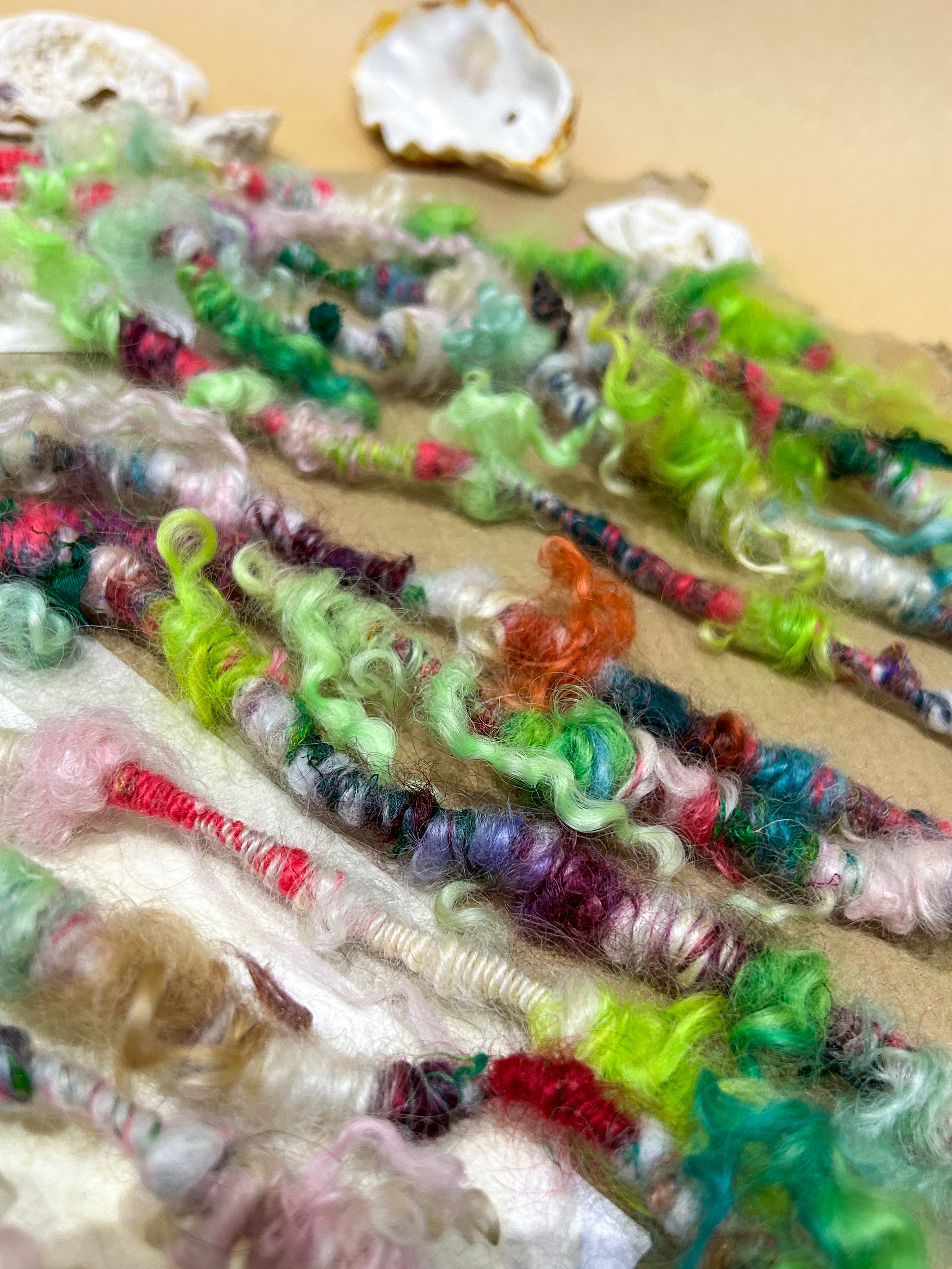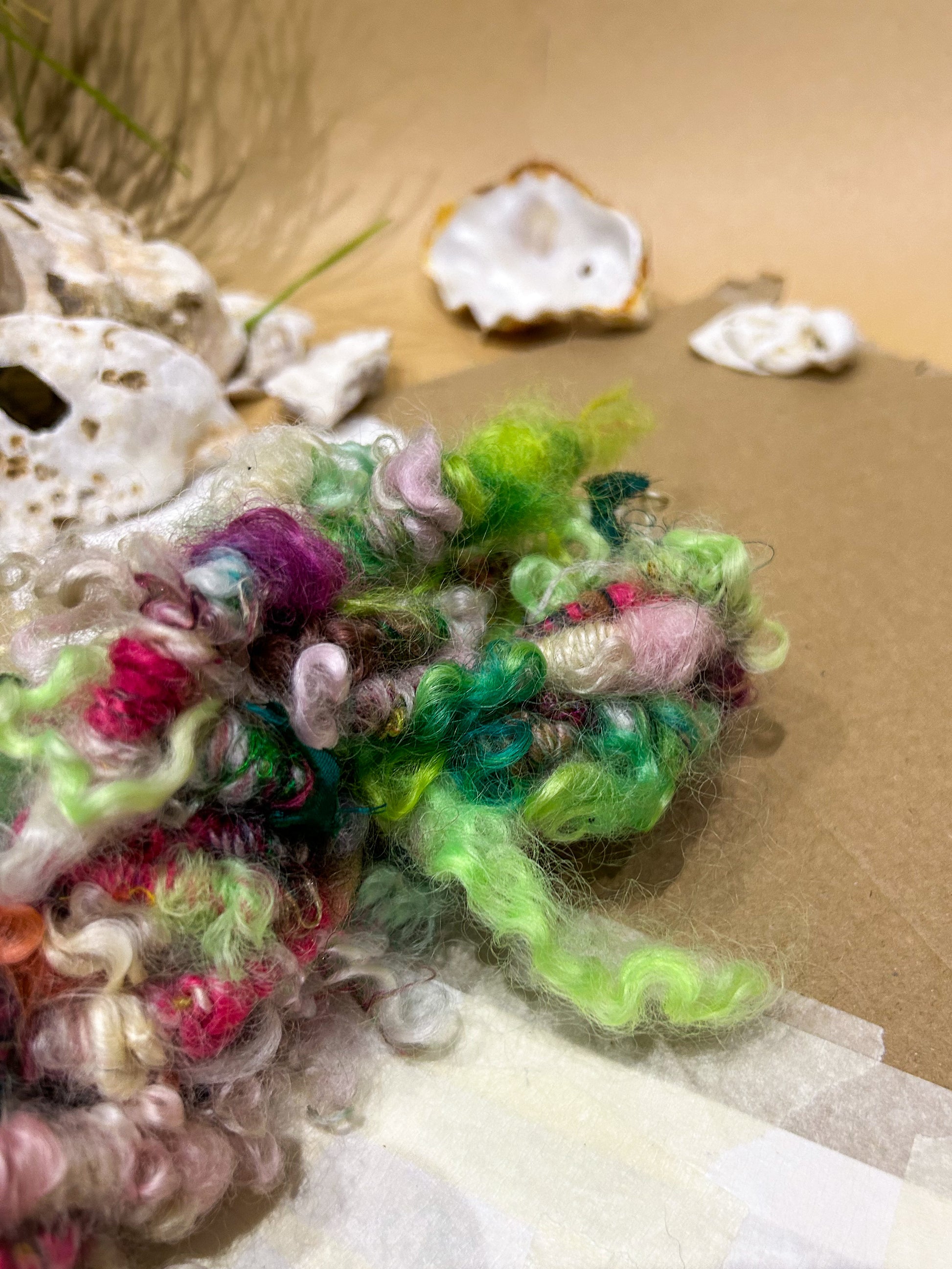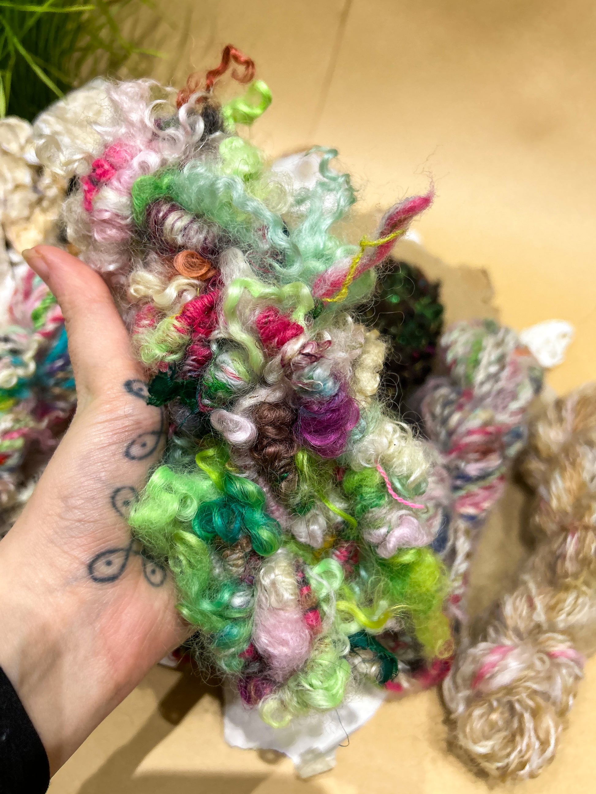 A truly unique blend of soft, smooth and luxurious fibres! The added lock shows the amazing defined curls of the natural fleece. A truly unique yarn, perfect to add a special something to your fibre art. Due to how chunky and textural it is this yarn would be best suited for weaving, weaving into knit/crochet, or for using with chunky needles.