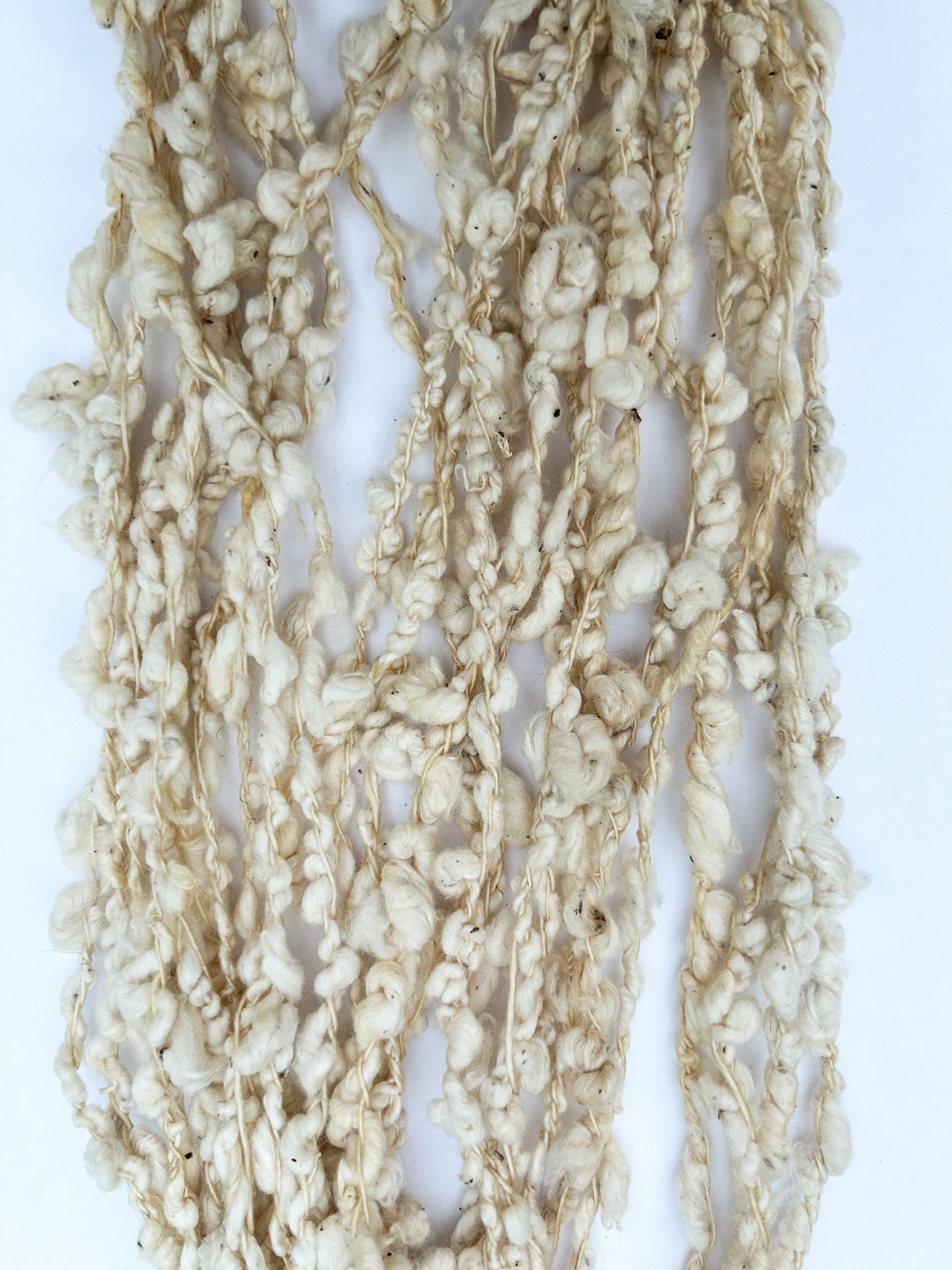 This skein is undyed and 105g in weight. Boucléd fluffy cotton with a Seacell core and binder.