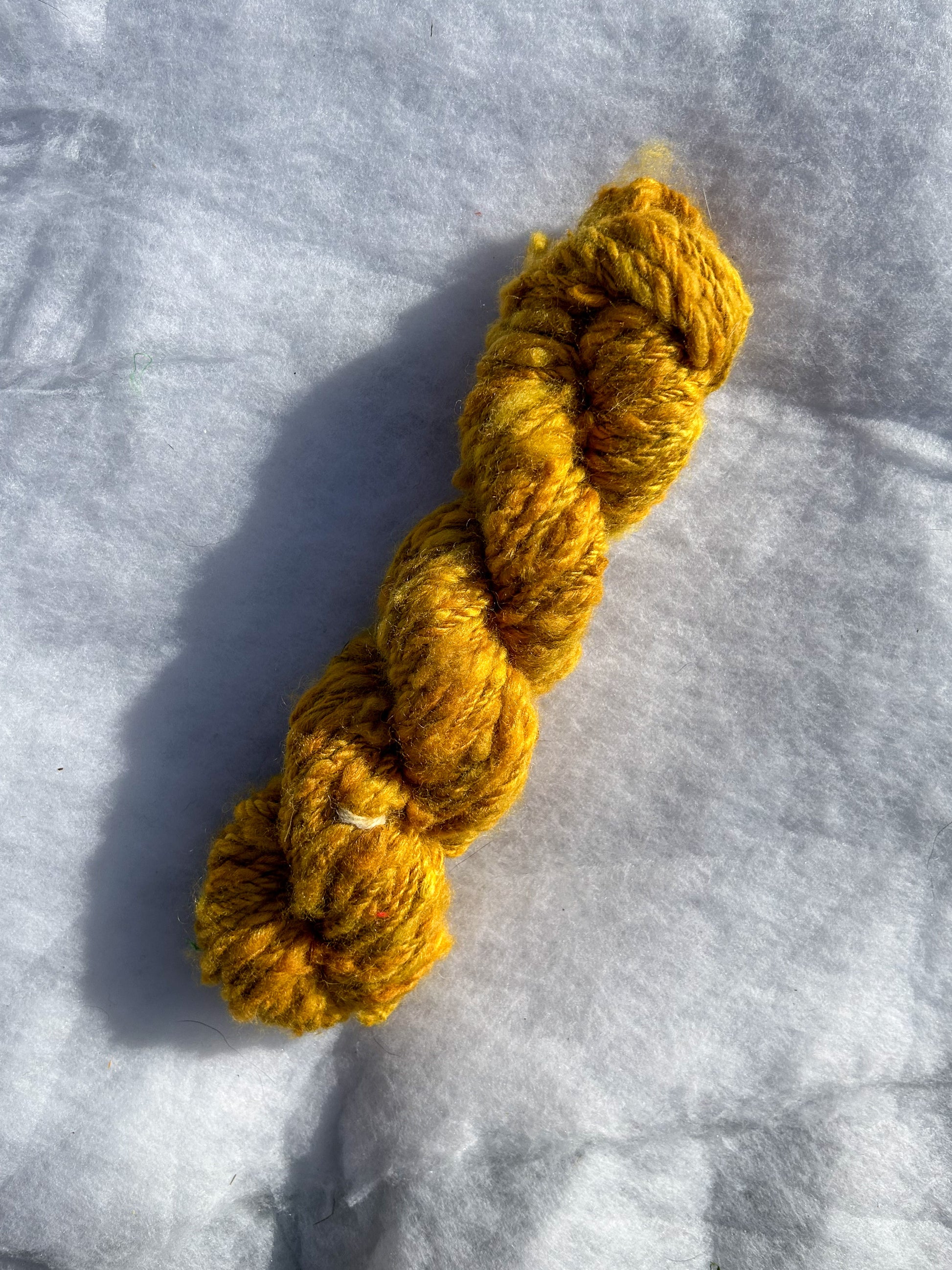 A Unique balanced 3ply, naturally deep yellow (Himalayan Rhubarb) Baby Alpaca yarn, spun and chain plied on my beloved Ashford Spinning Wheel. This skien has been carded with felted alpaca add ins.