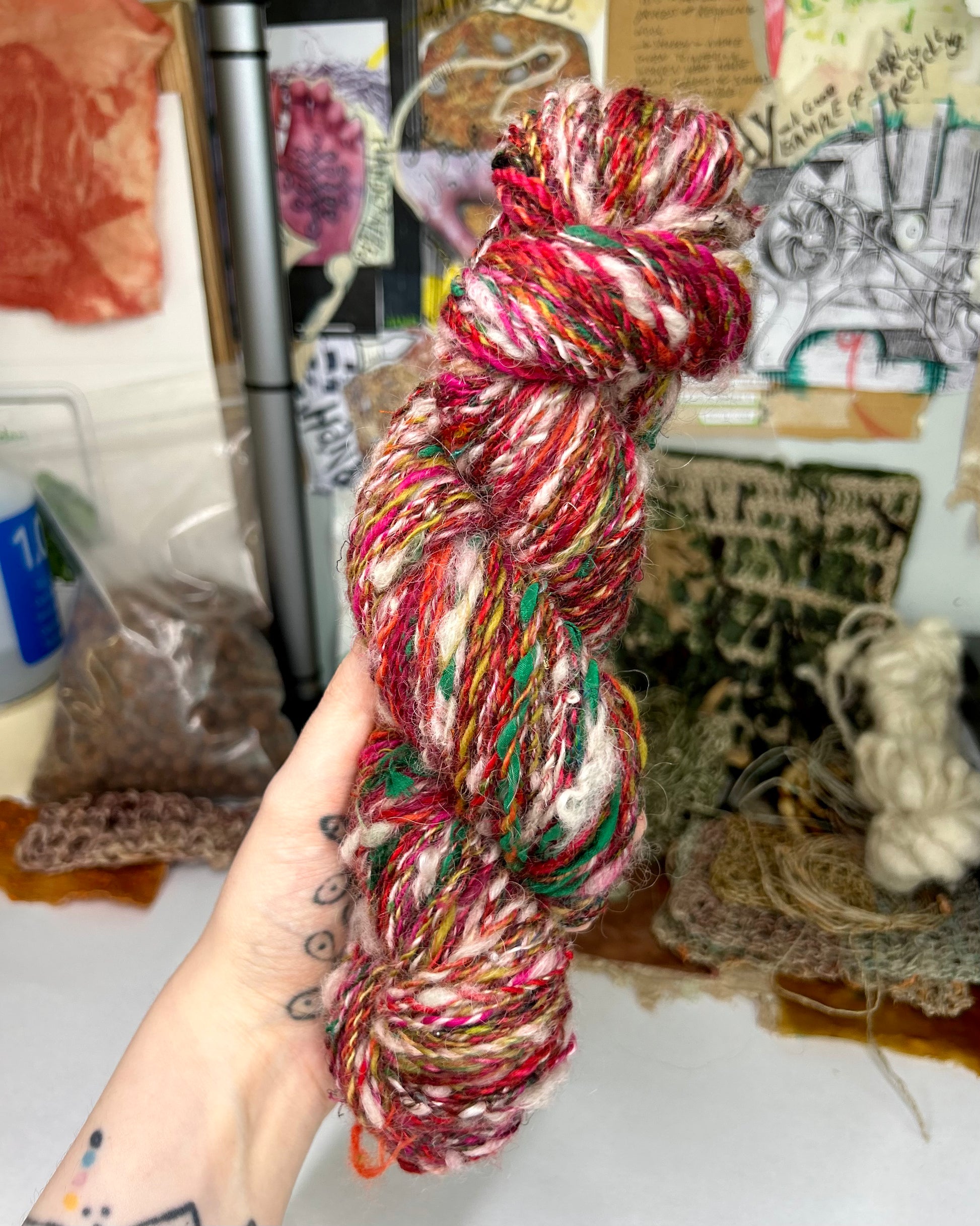 'Scarlet Double Daisy' merino, teeswater, wensleydale. sari silk and ribbon 2ply/100g