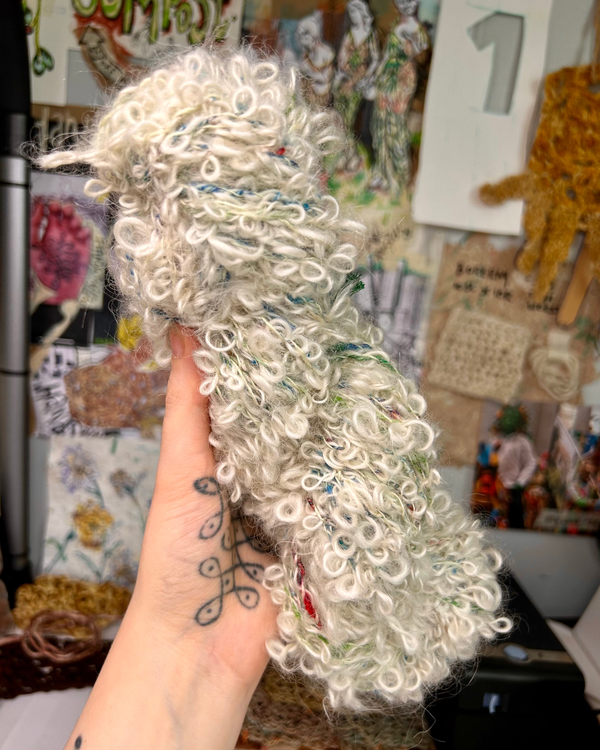 A beautiful, premium quality kid mohair bouclé. Spun onto a merino and sari silk core, bound with an eri silk binder. An absolutely stunning yarn. Spun and plied on my beloved Ashford Spinning Wheel.