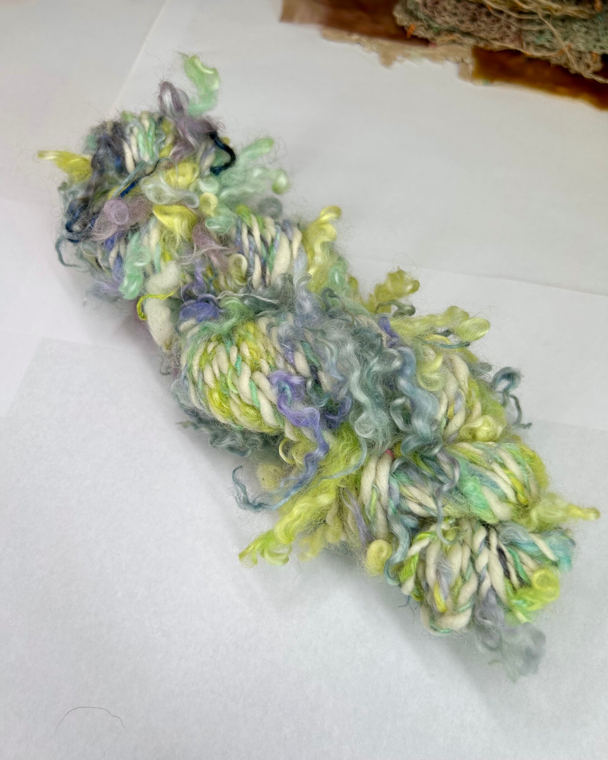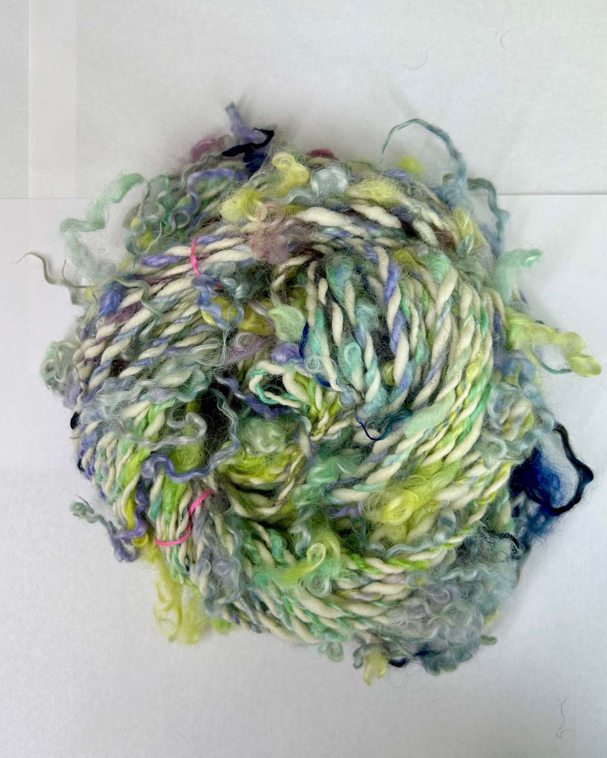 A truly unique blend colours spun to show of the beautiful soft and silky Masham locks! A super textural, colorful and unique yarn, perfect to add a special something to your fibre art.